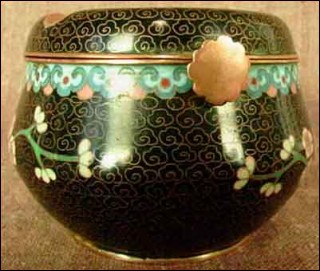 Ashtray with tip up top in cloisonne made in Meijin around 1950. The tipycall pattern of peach flowers on black background is hand working. Good condition. 2"1/4 high 3"1/4 diameter