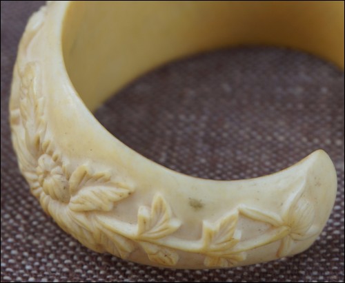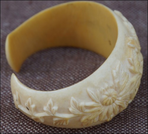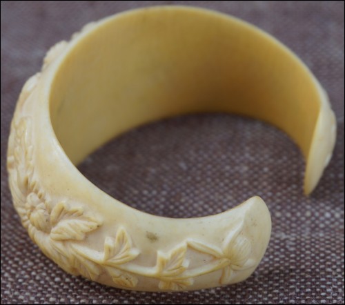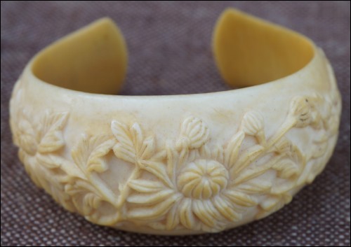 French Vietnam ivory bracelet chrysanthemums mums flowers carved made in French Indochina. Good condition. 2 1/2" width, 1 3/16" depth, 2 1/8" hight, 3/8" thickness and weight 0.987oz (28 grams).