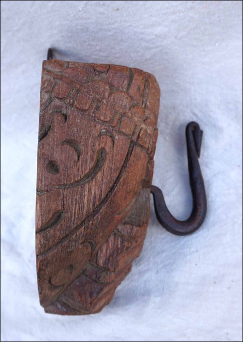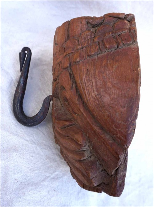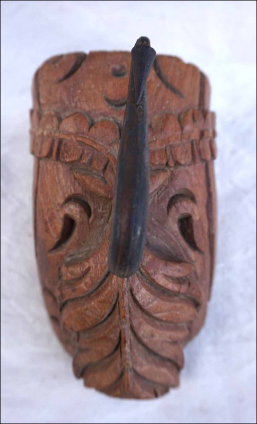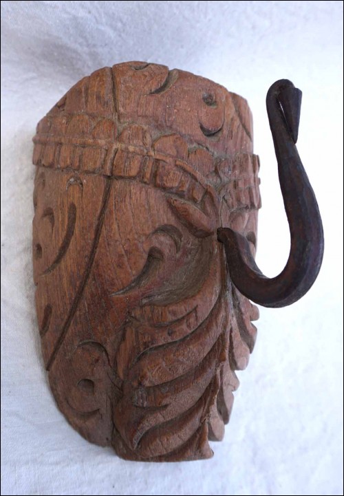 Élément d'architecture hindoue du XIXe siècle, tête d'éléphant végétale en teck avec crochet en fer forgé, Ganesh Inde. Hauteur 17,8 cm, largeur 9,5 cm, profondeur 11 cm.
