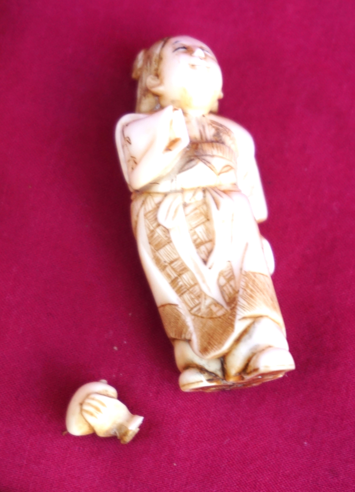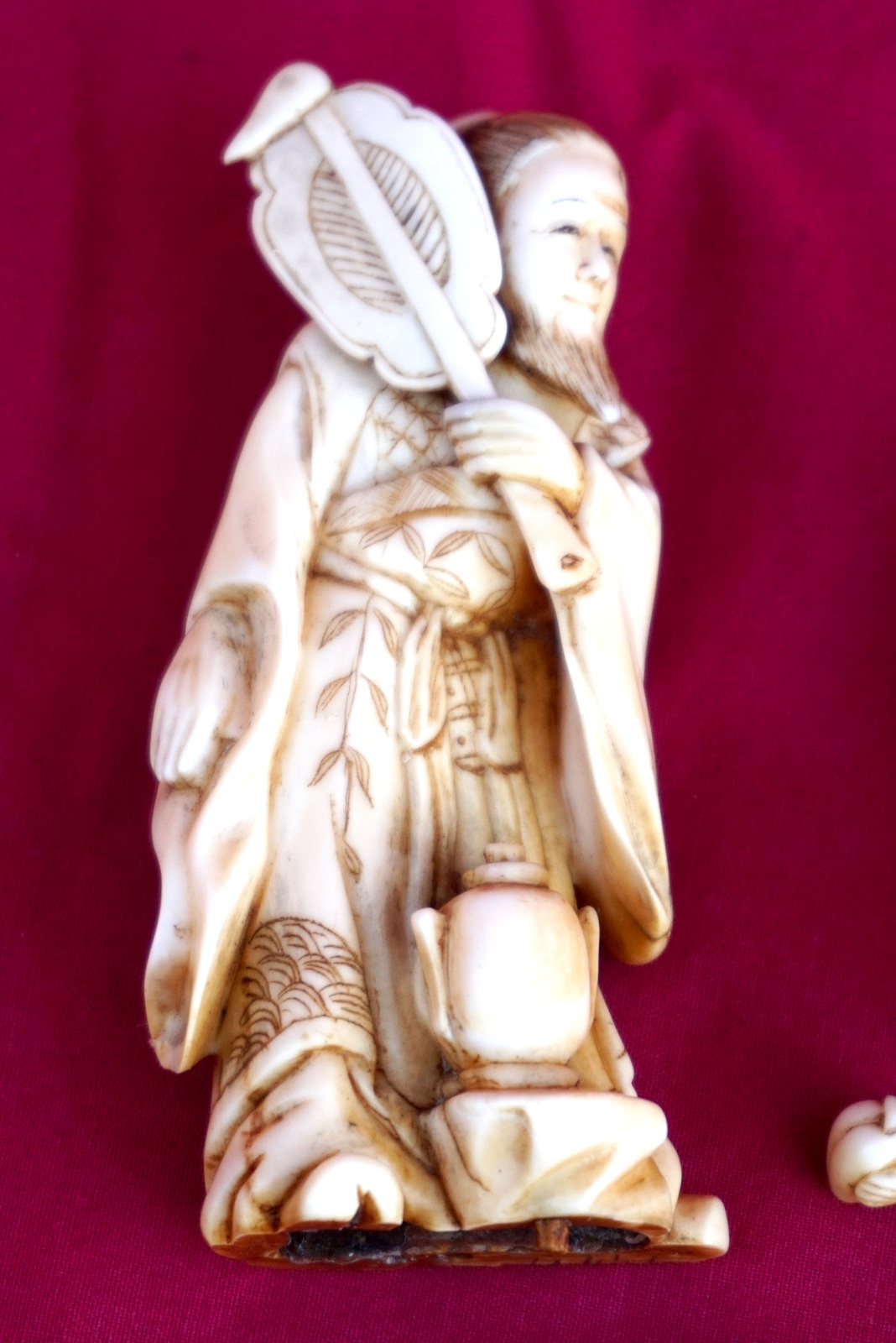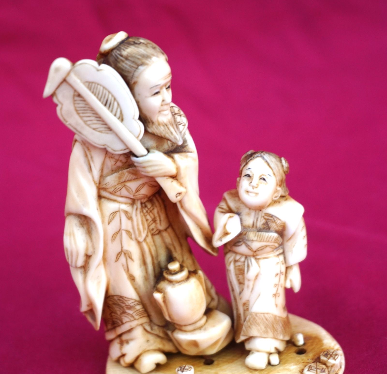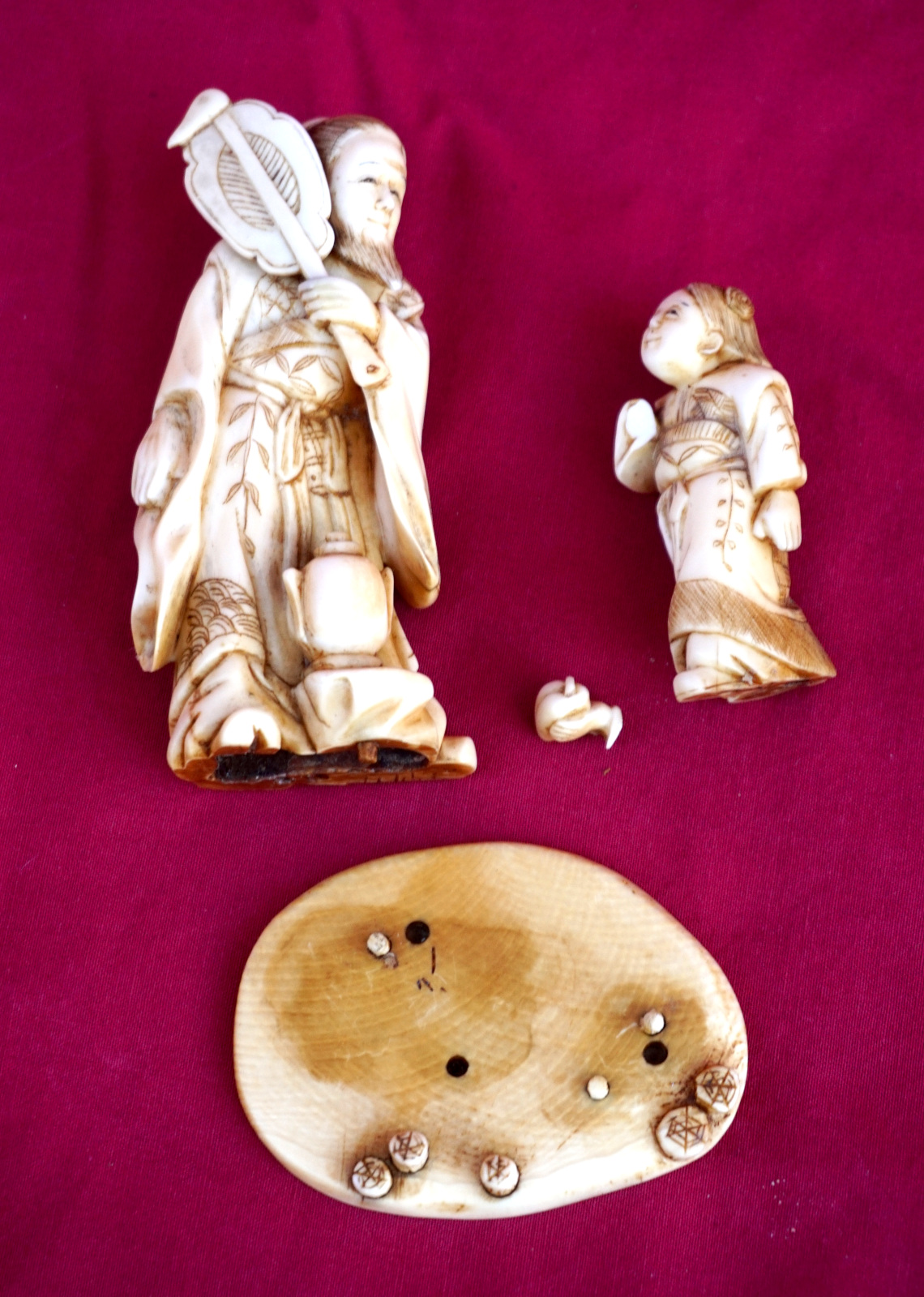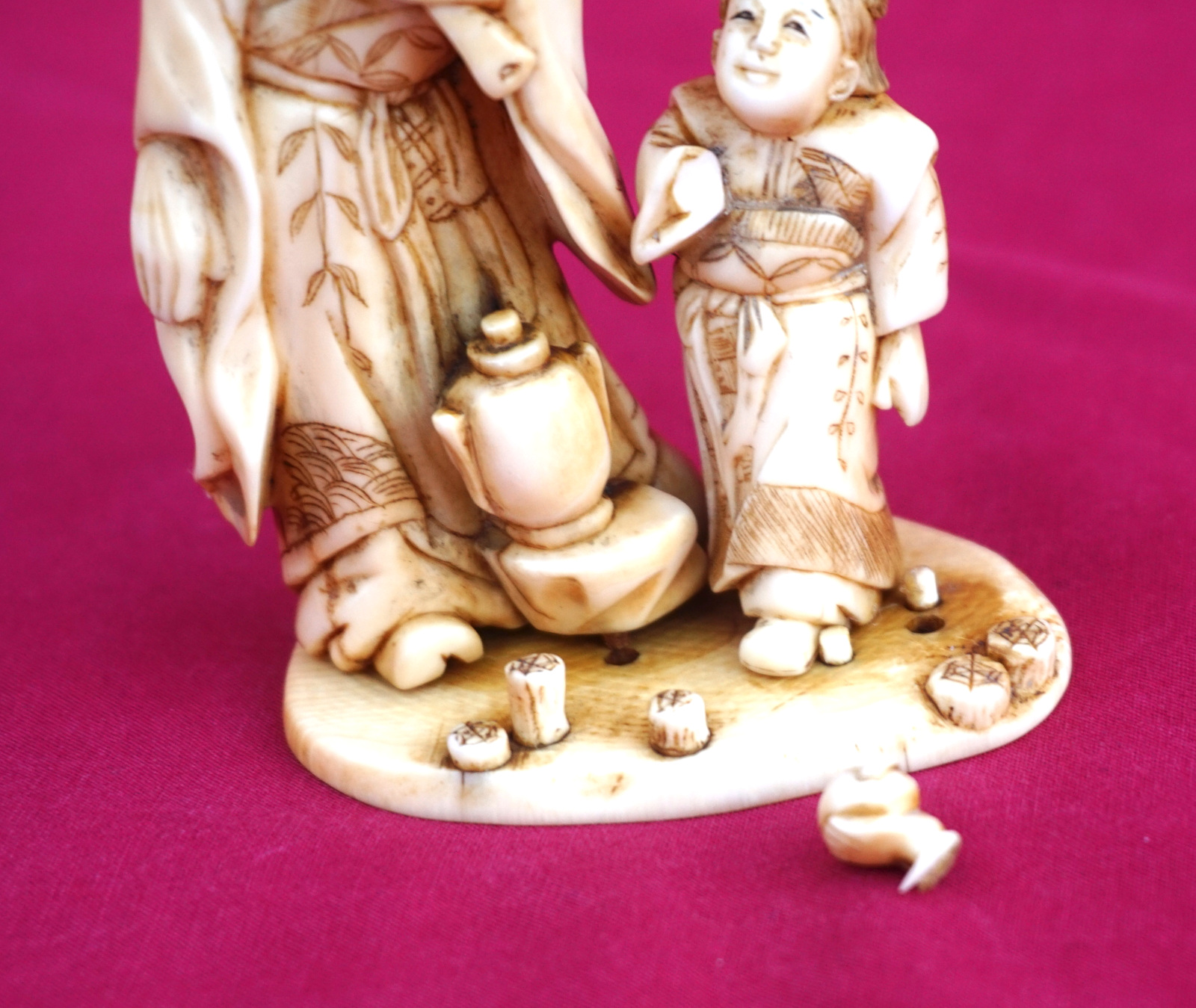 Antique Japanese ivory carved okimono showing god Jurojin? with child, signed under the base. 3" (7.7cm) tall for the god and 1 3/4" (4.5cm) for the child. Complete needs repairs as shown by the following pictures.