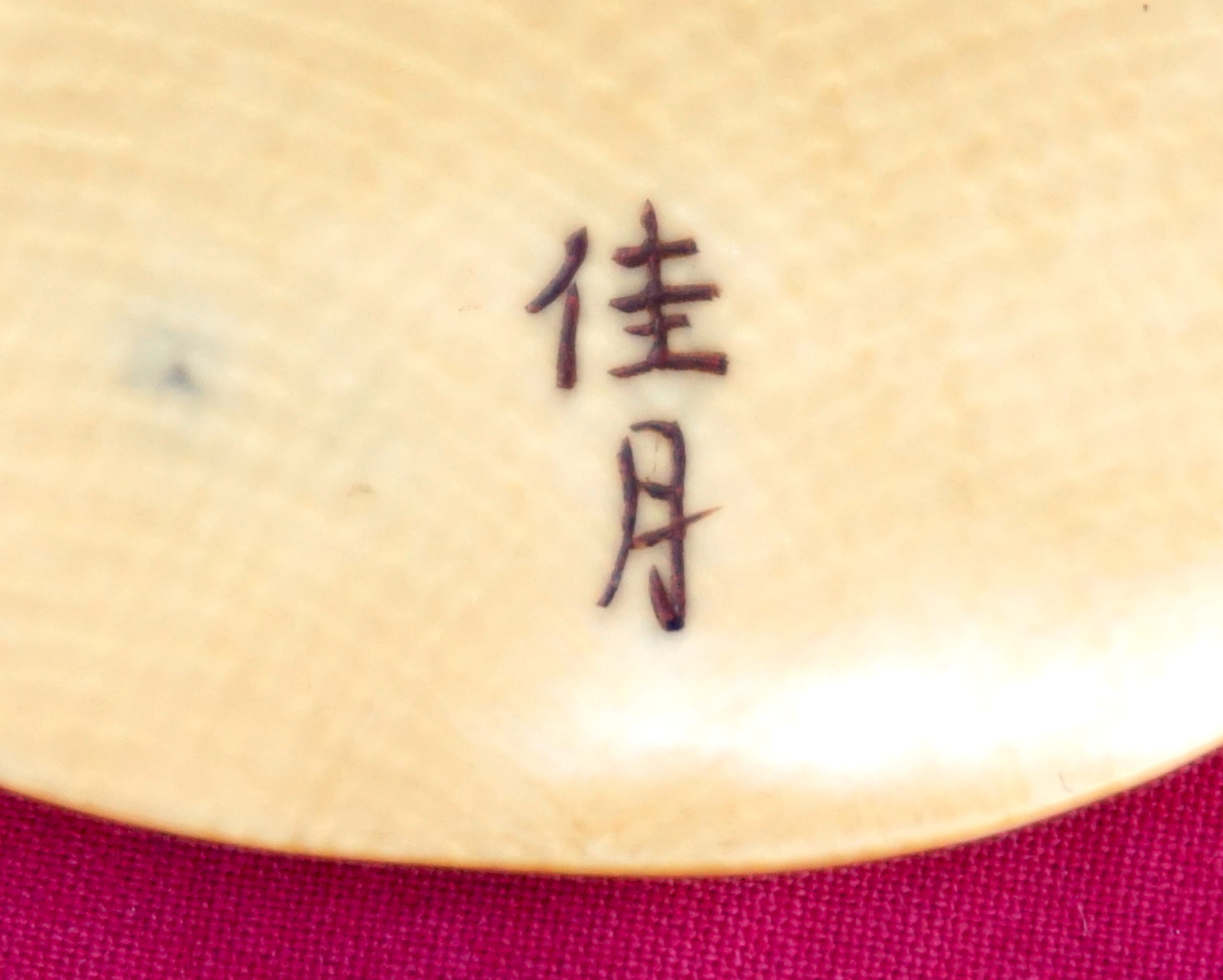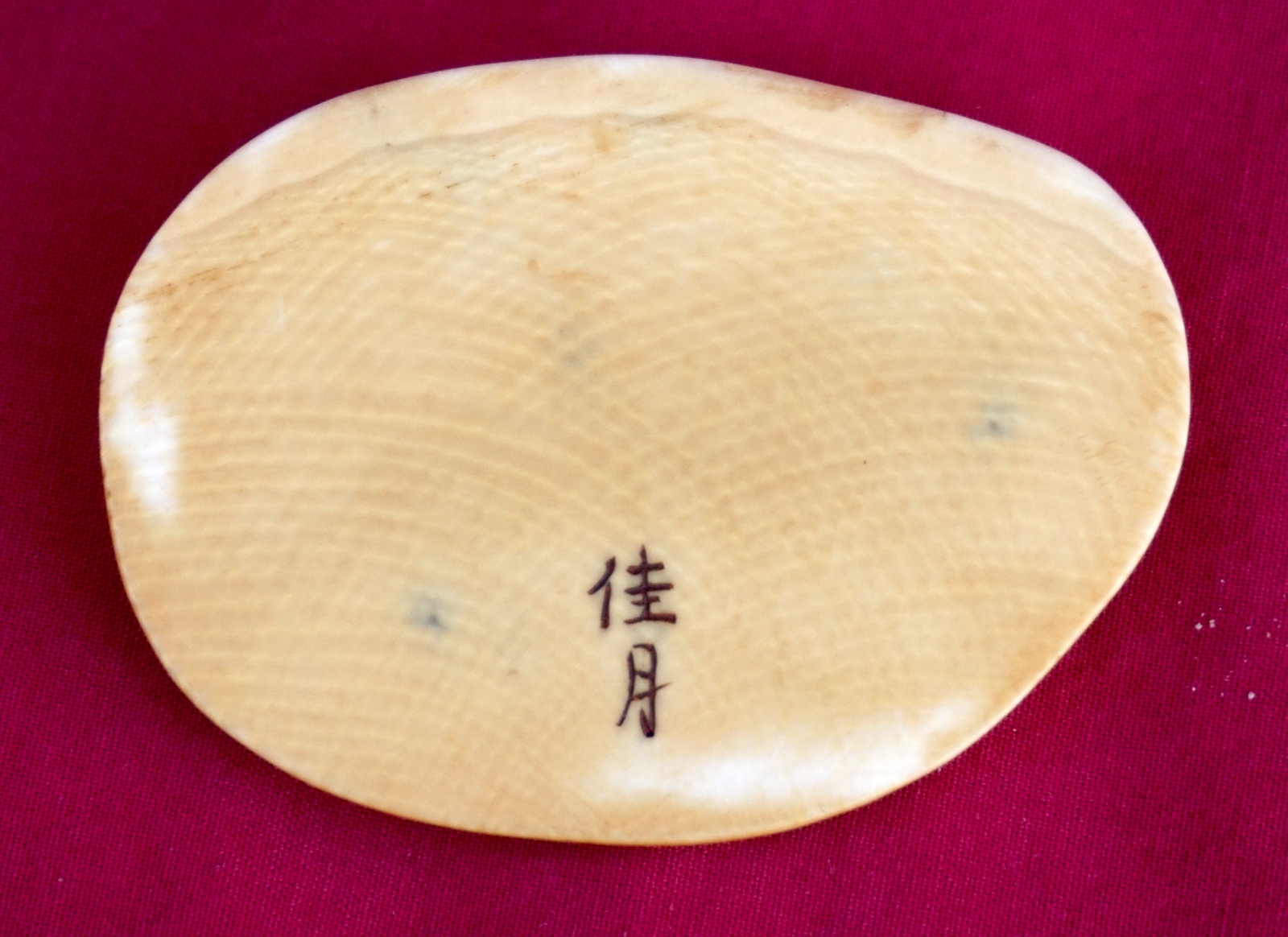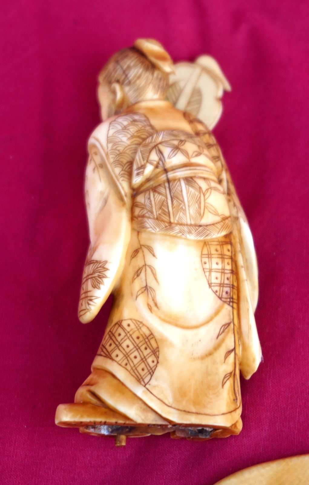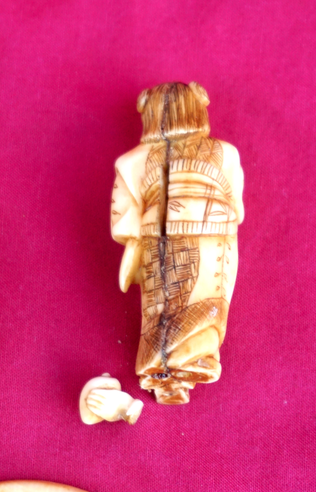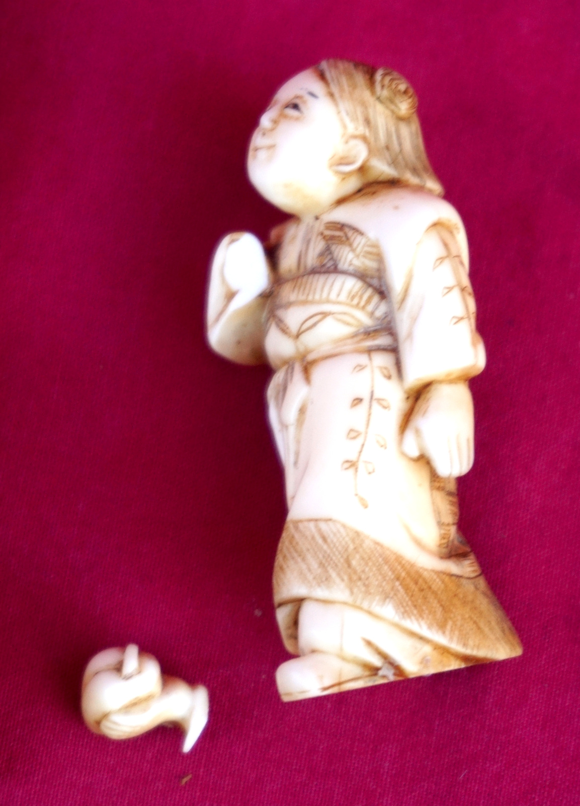 Antique Japanese ivory carved okimono showing god Jurojin? with child, signed under the base. 3" (7.7cm) tall for the god and 1 3/4" (4.5cm) for the child. Complete needs repairs as shown by the following pictures.