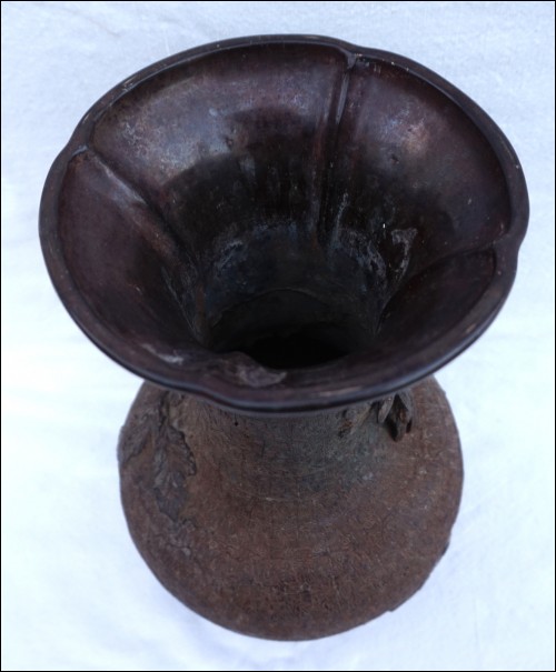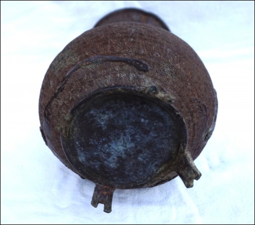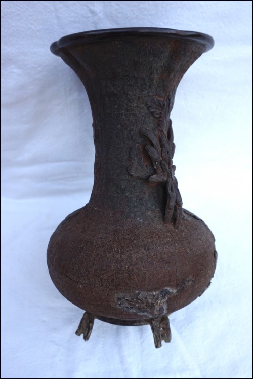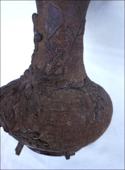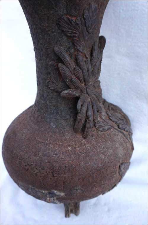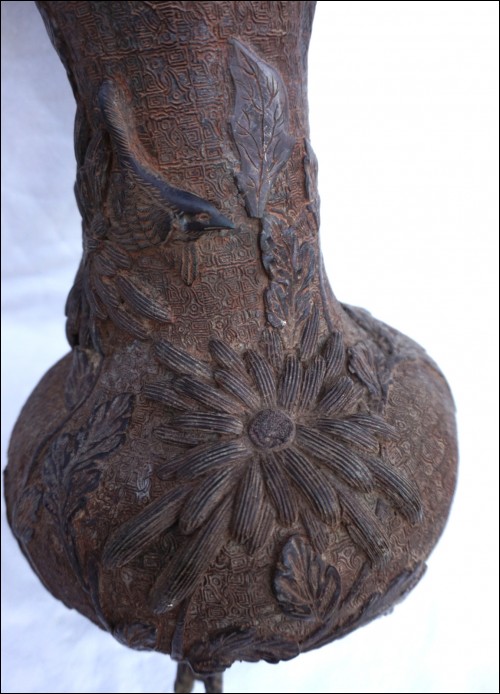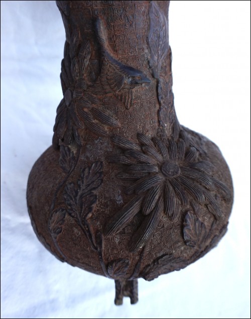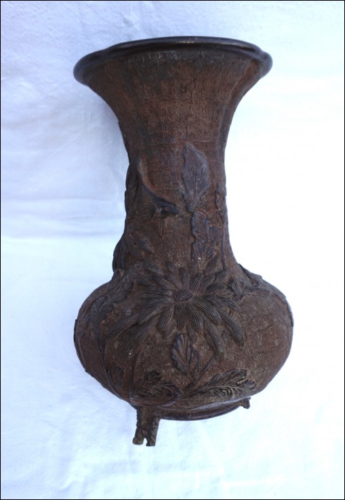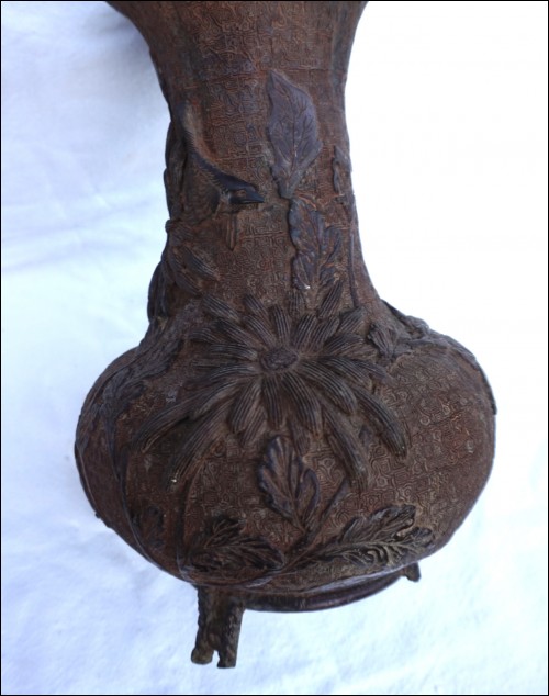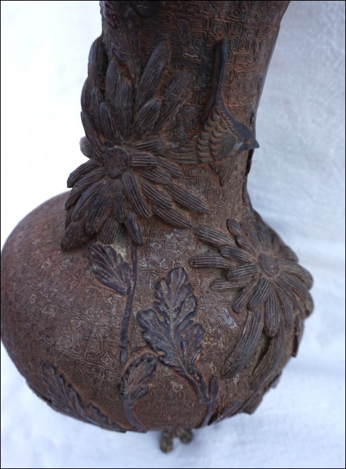 Vase en bronze, cire perdue, Chrysanthème à l'oiseau, Japon époque Edo. Il est dans l'état où nous l'avons découvert: pieds refaits, traces de soudure à l'étain et un pied manquant, quelques trous. Hauteur 29.5 cm, diamètre au corps 19 cm, poids 2.6 kg.