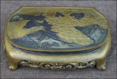 Double inkwells in gilt and white metal showing on the lid peacocks in the landscape made in Japan during the 1910's. The inkwells inside are in glass. Good condition. The base has been repair. 4 3/4" width 3" depth and 1 7/8" high.