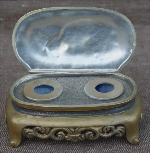Encrier double en métal du Japon vers 1910. Le couvercle est à décor de paons, l'intérieur porte deux encriers en opaline. L'ensemble est en bon état, le piètement a été réparé. Hauteur 4,6 cm, largeur 12,2 cm, profondeur 7,5 cm.