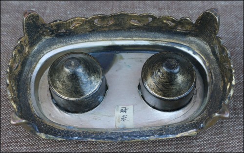 Japanese Double Inkwells Gilt White Metal Peacocks 1910