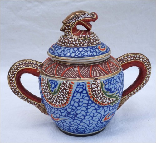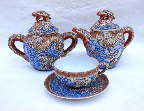 Japanese dragonware moriage porcelain tea set including tea pot, sugar pot and cup and saucer made during the 1950's. The cup has a lithophane geisha on the bottom.The cup measures 2" (5.2cm) diameter and 3 3/4" (9.4cm) height. Perfect condition as shown by the following pictures.