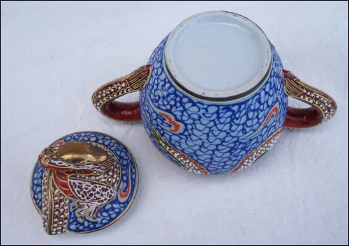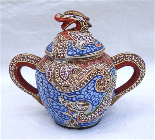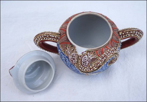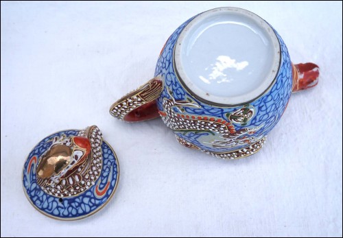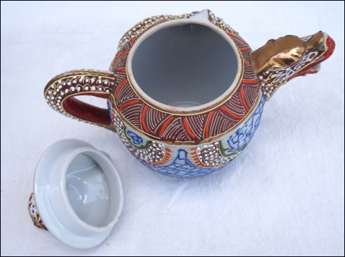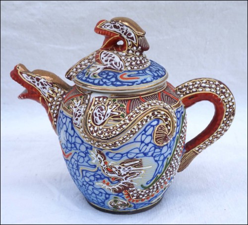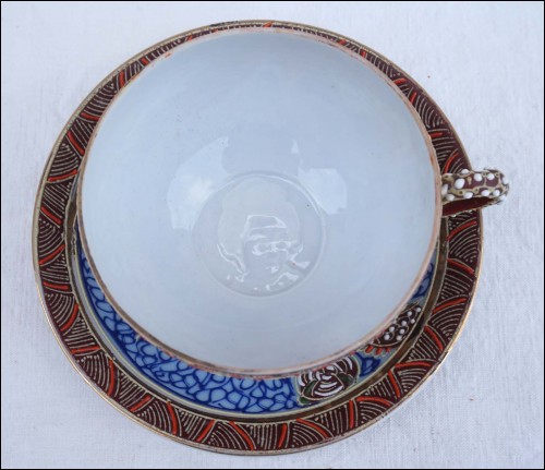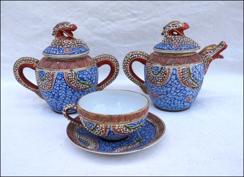 Service pour le thé en porcelaine dragonware moriage du Japon, milieu XXe. Comprenant 3 pièces : théière, sucrier et une tasse avec sa sous tasse. Au fond de la tasse lithophane , une tête de geisha. Bel état. Pour la tasse: hauteur 5,2 cm, diamètre 9,4 cm.