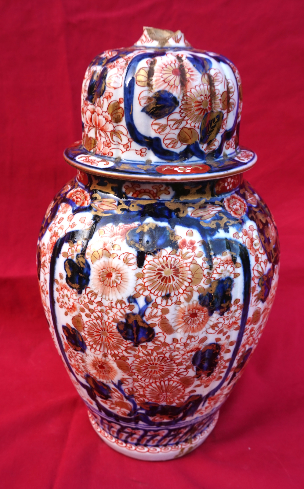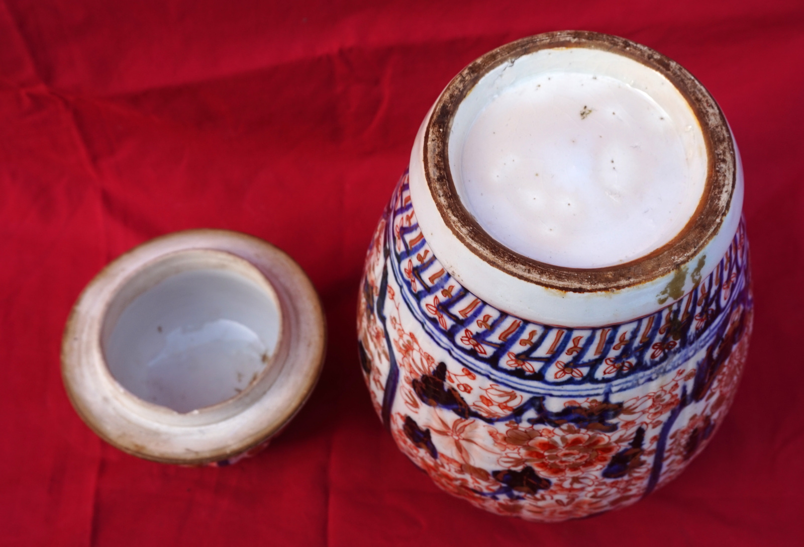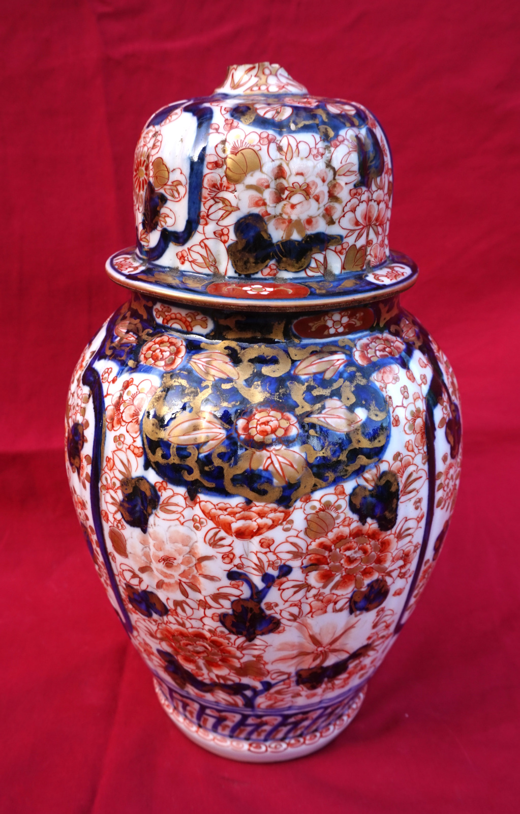 Grand pot à couvercle en porcelaine d'Imari, première moitié du XIX° siècle. Hauteur 29.2 cm, diamètre au corps 15.2 cm. Bel état, le bouton de préhension est cassé sur le couvercle.