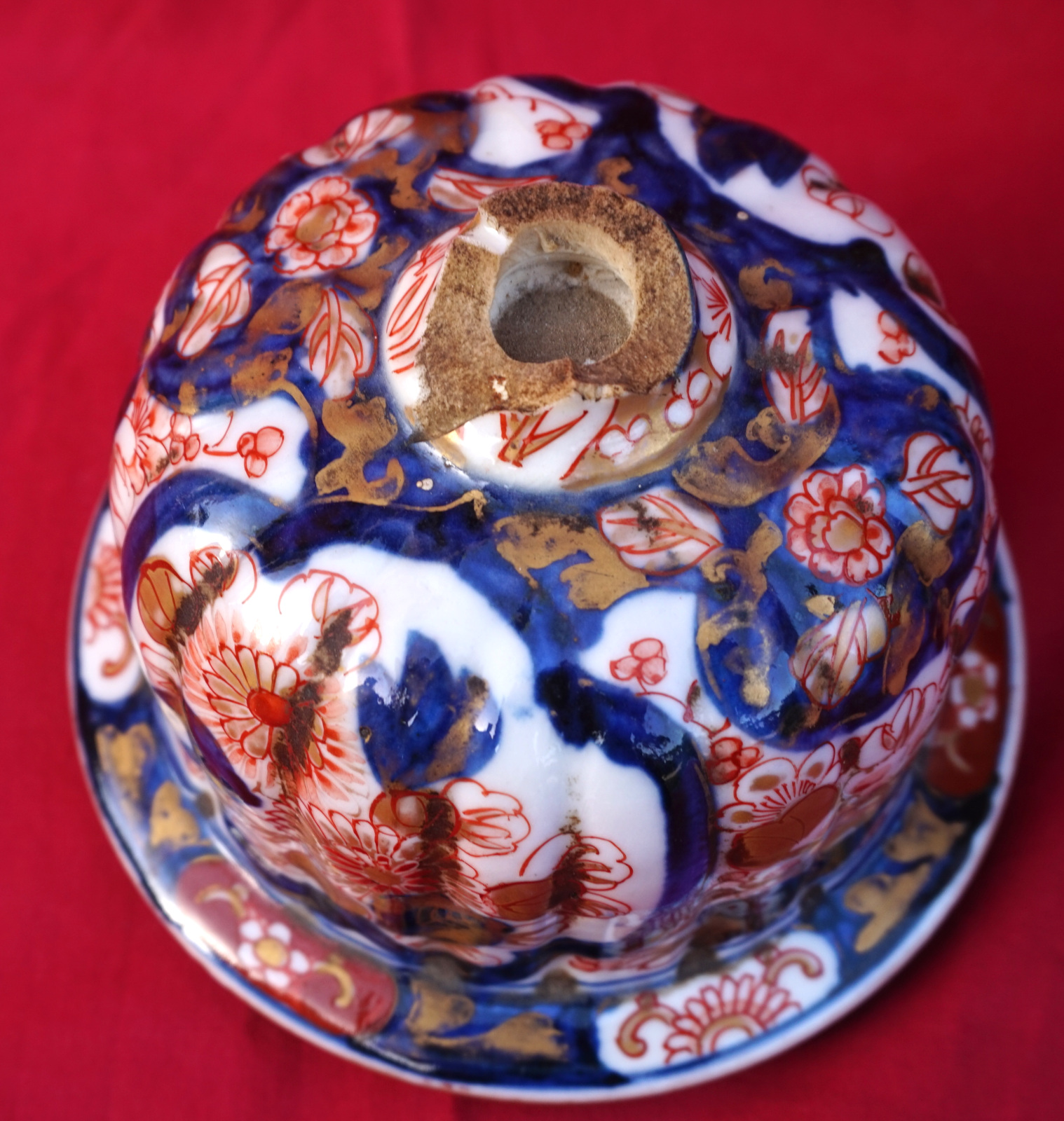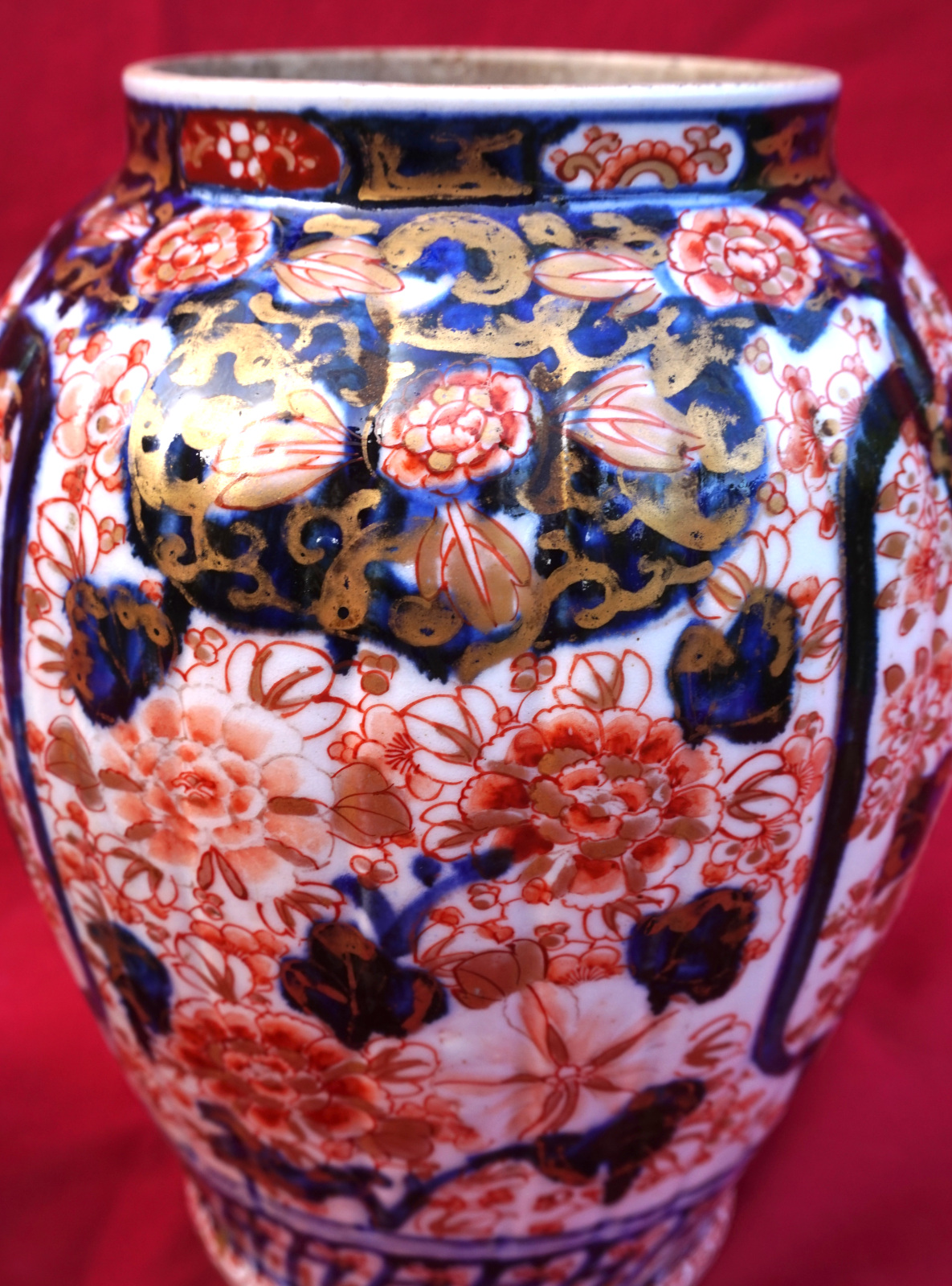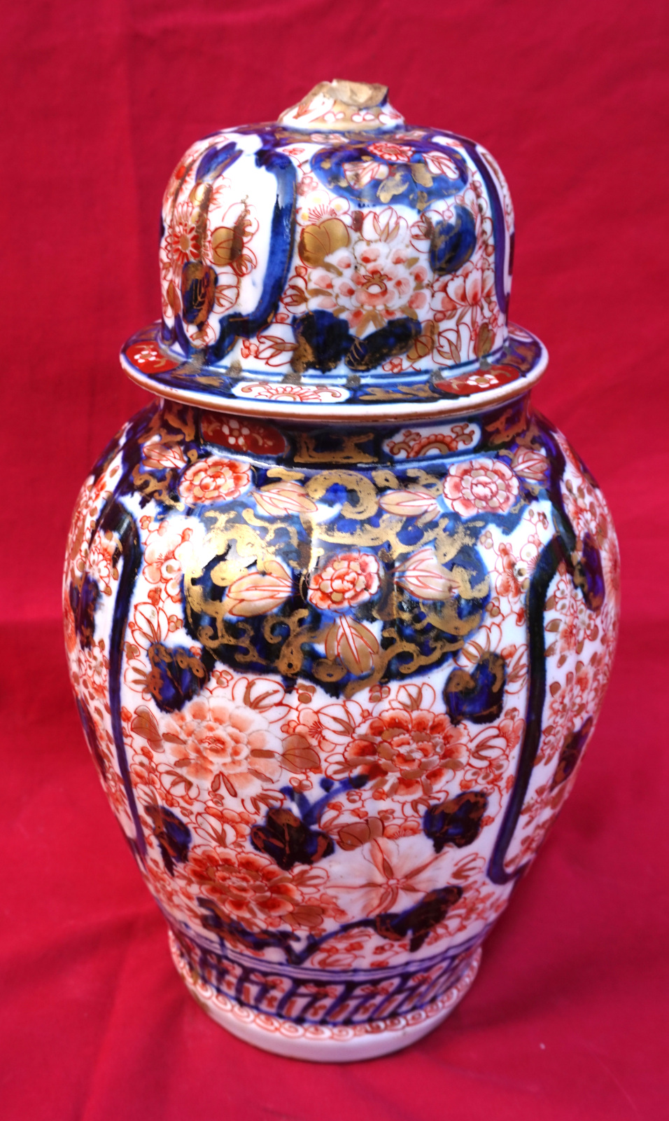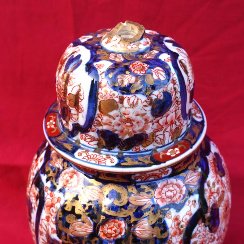 Grand pot à couvercle en porcelaine d'Imari, première moitié du XIX° siècle. Hauteur 29.2 cm, diamètre au corps 15.2 cm. Bel état, le bouton de préhension est cassé sur le couvercle.
