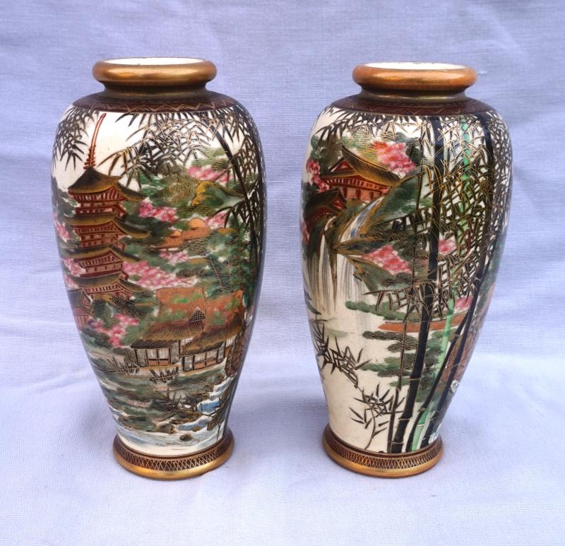 Paire de vases en Porcelaine de Kyoto Satsuma, vues du château de Kumamoto par Kayama / Kazan, époque Taisho vers 1910/20. Signé sur leurs fonds. Hauteur 21.7 cm, diamètre au corps 10.2 cm. Parfait état.