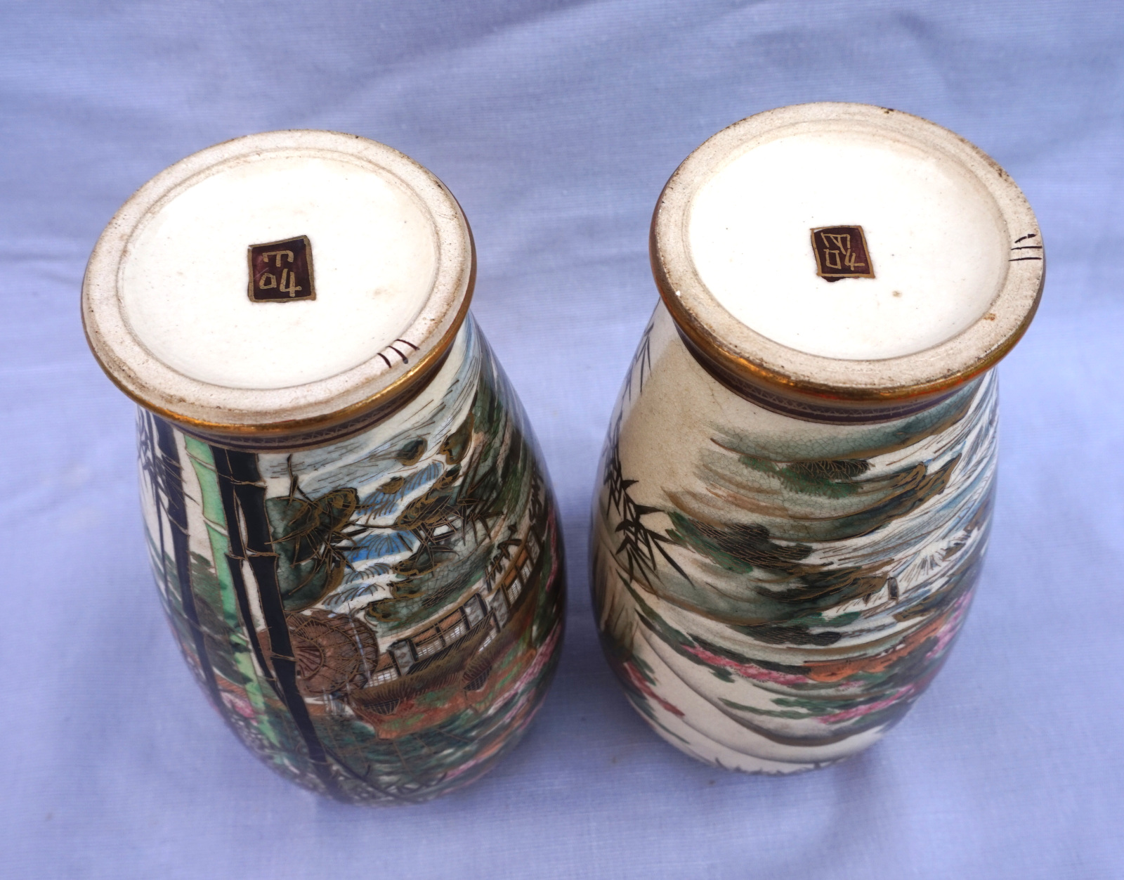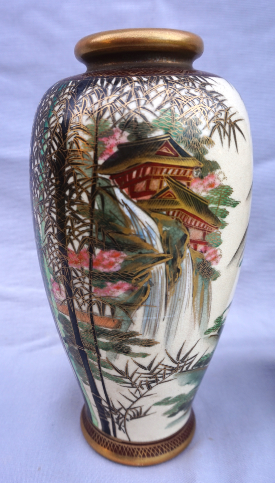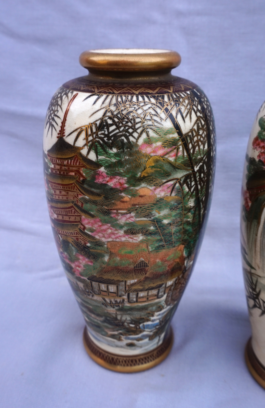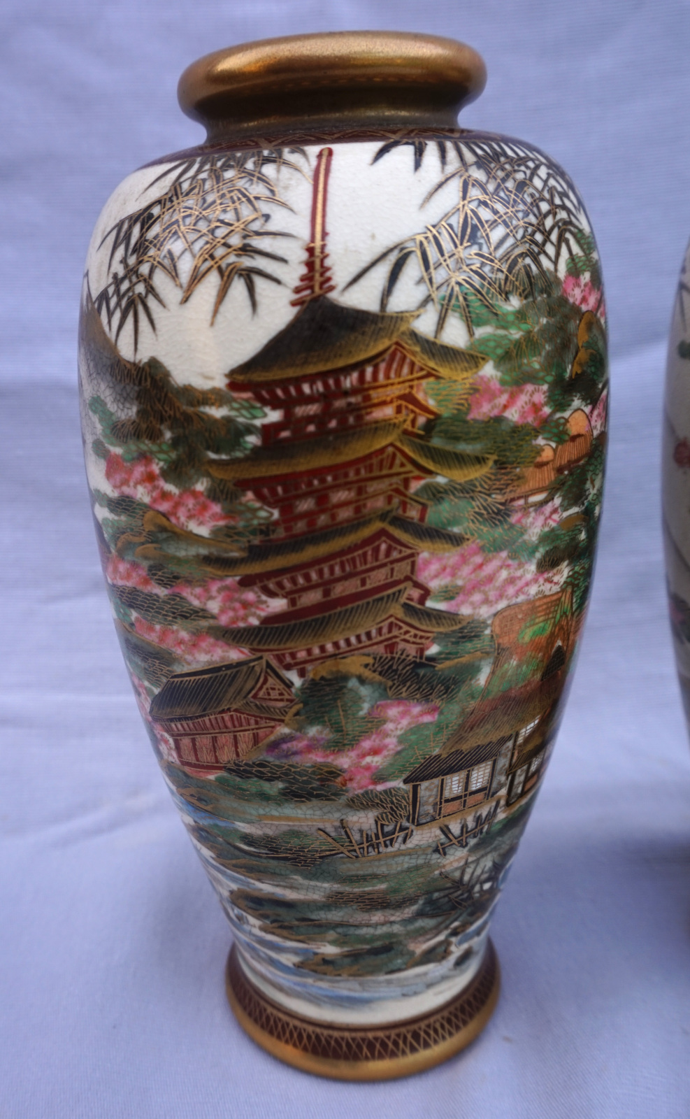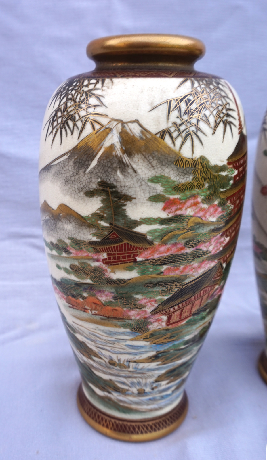 Japanese kyoto satsuma porcelain pair vases showing Kumamoto castle by Kayama Kazan made during Taisho area c 1910'/1920's. They are signed under the base. 8 1/2" (21.7cm) height, 4" (10.2cm) diameter to the body. Perfect condition