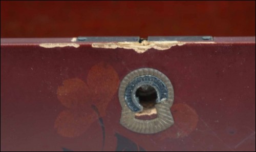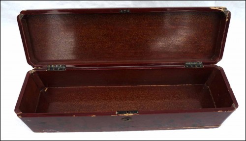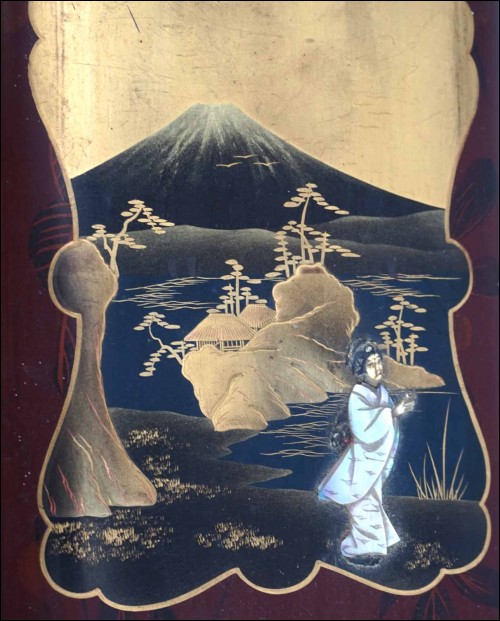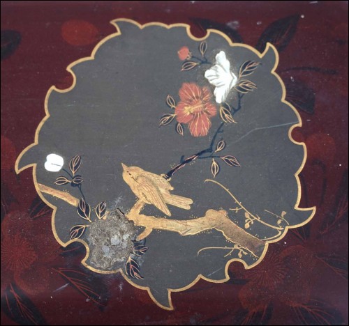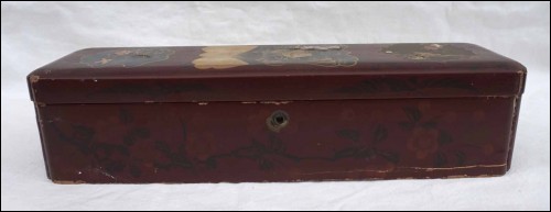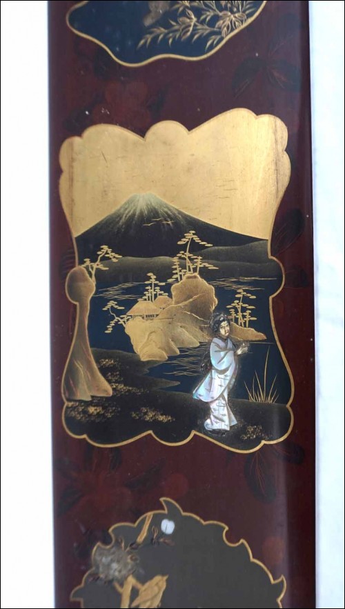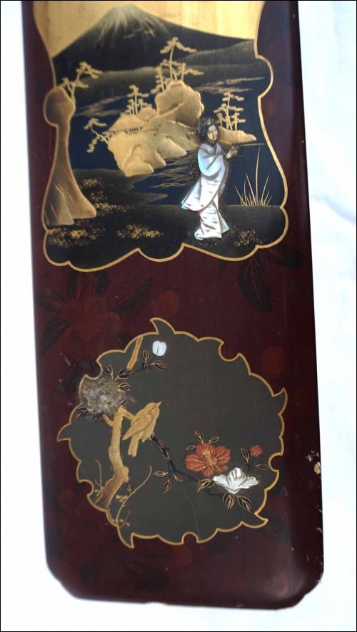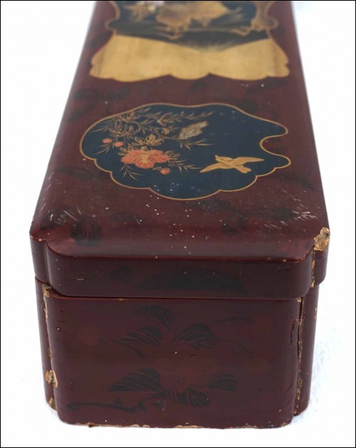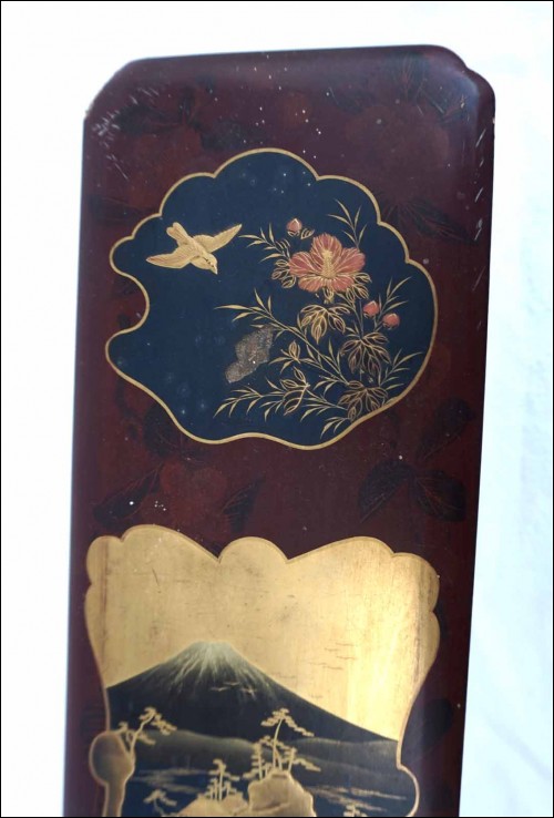 Boite à document en lacque "maki-e" du Japon, époque meiji, vers 1910. Sur le devant de la scène, une dame de qualité avec le mont Fuji en arrière plan, pour le médaillon central. Il manque un oiseau sur le troisième médaillon. Longueur 38cm, profondeur 11cm, hauteur 9cm.