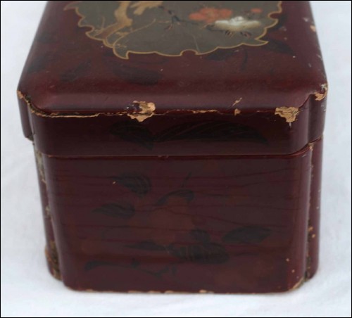 Antique Japanese document box in lacquer "maki-e" made around 1910 Meiji period . In front 3 medallions hand painting depict a young lady with the Fuji mount and two other with birds on flowered branches. Good condition only one bird is missing on one medallion 15" width 4"1/4 depth 3"1/4 high.