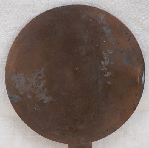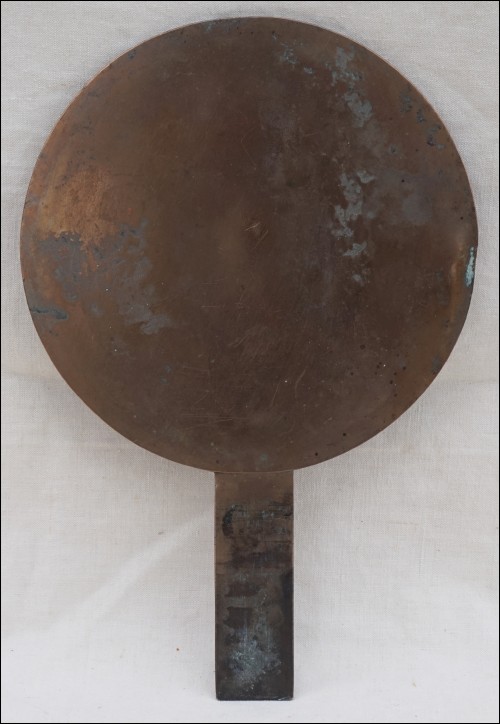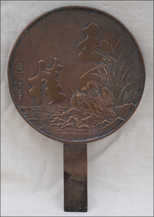 Antique geisha hand mirror in engraved bronze formerly silvered showing a poem and a couple of jays made during the Meiji period. Signed in good condition 2 small bumps as you can see on the pictures below. 10 5/8" high 7 1/8" diameter.