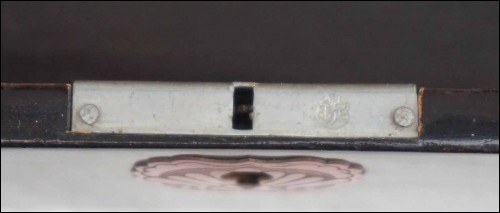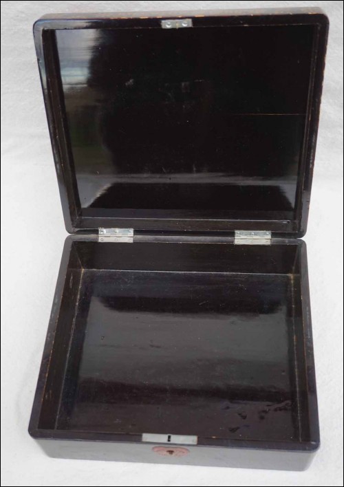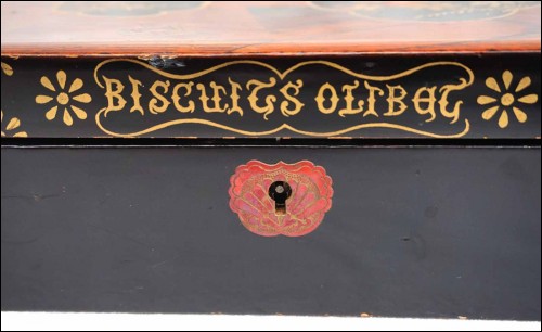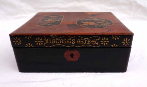 French advertising lacquered paper mache box showing bird in medallion made for the Biscuit Olibet during the 1900's. It's signed on the lock. 7 3/4" (19.7cm) length, 6 3/4" (17.2cm) width, 2 3/4" (7cm) height. Beautiful condition as shown by the following pictures.