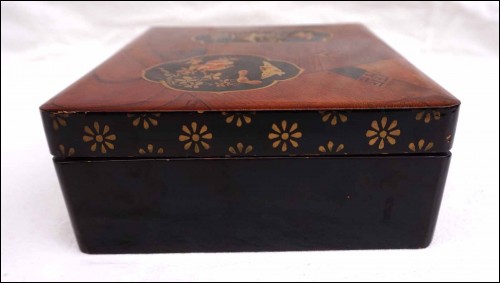 Boite en papier mâché laqué orné de médaillon d'oiseaux, publicité pour les biscuits Olibet, vers 1900. Elle est signée sur sa charnière. Longueur 19,7 cm, largeur 17,2 cm, hauteur 7 cm. Très bel état.