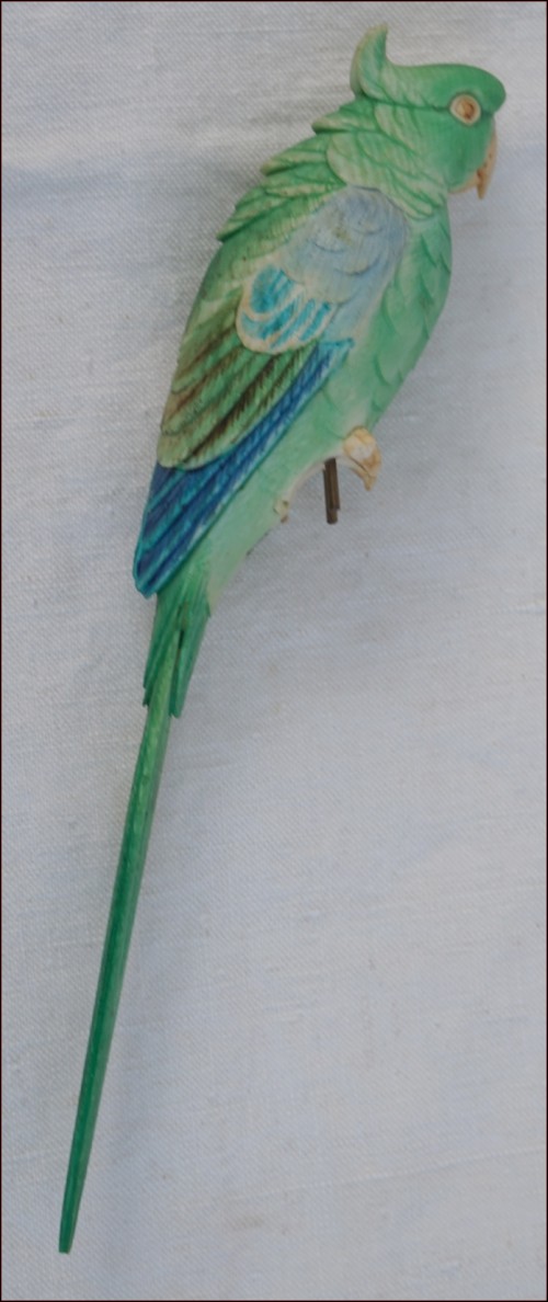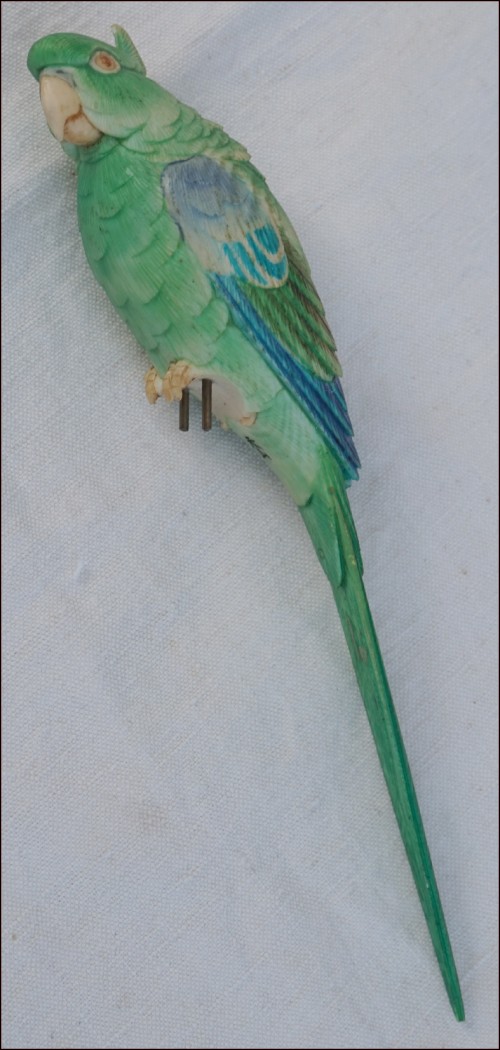 Okimono pour cage ou perchoir de Tenzan, ère Meiji fin XIXe siècle. Perruche en ivoire sculptée teinté à l'encre, signé sous la queue. Bel état, un léger accroc à la crête et un doigt de patte cassé. Hauteur 15,5 cm.