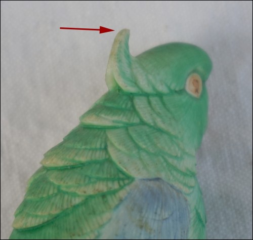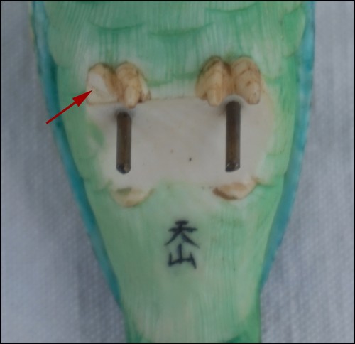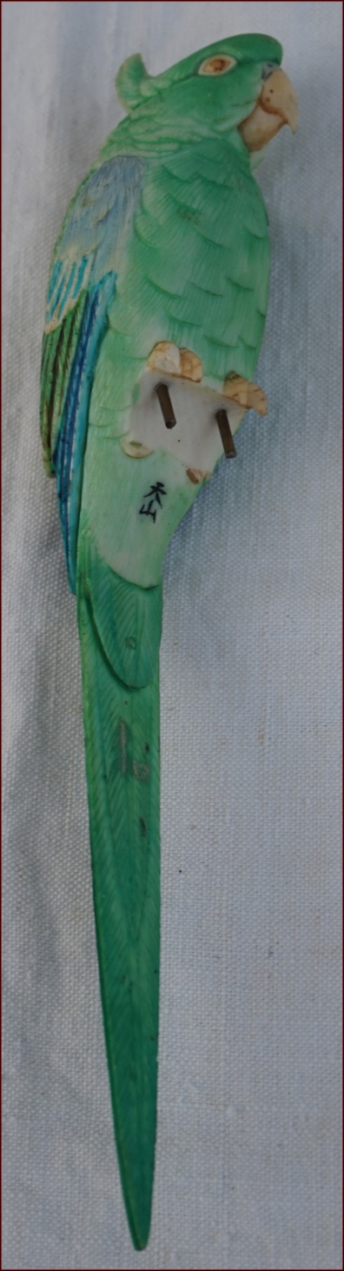 Parakeet for cage of perch okimono in hand carved and ink painted ivory made by Tenzan during the Meiji period late 19th century. It's signed under the tail. 6 1/8" (15.5cm) height. Good condition a chip on the crest and a finger broken on a foot as presented on the following pictures.
