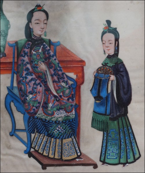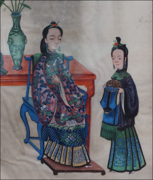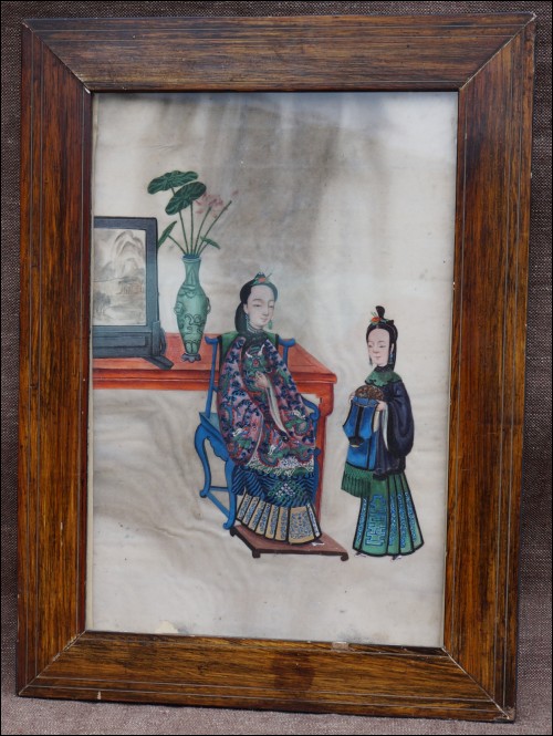 Concubine impériale Qing dynastie des mandchous, une épouse de l?empereur Yongzheng (1722-1735) et sa dame de compagnie, peint à la gouache sur papier de riz et encadré de palissandre à filets de laiton. Quelques accidents sur le papier de riz, traces de fumées de lampe à beurre. L'ensemble est du XVIIIème siècle. Pour le cadre : hauteur 38 cm, largeur 28,3 cm.