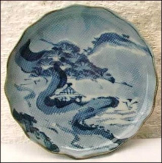 Small saucer plate in fine porcelain made by an artist of the Arita country during the XX century. The fine paste has been pressed between two linens. The hand painting pattern depicts the Mount Fiji with the great blue enamels. Good condition. Signed on the back. Good condition. 3 ¾" diameter.