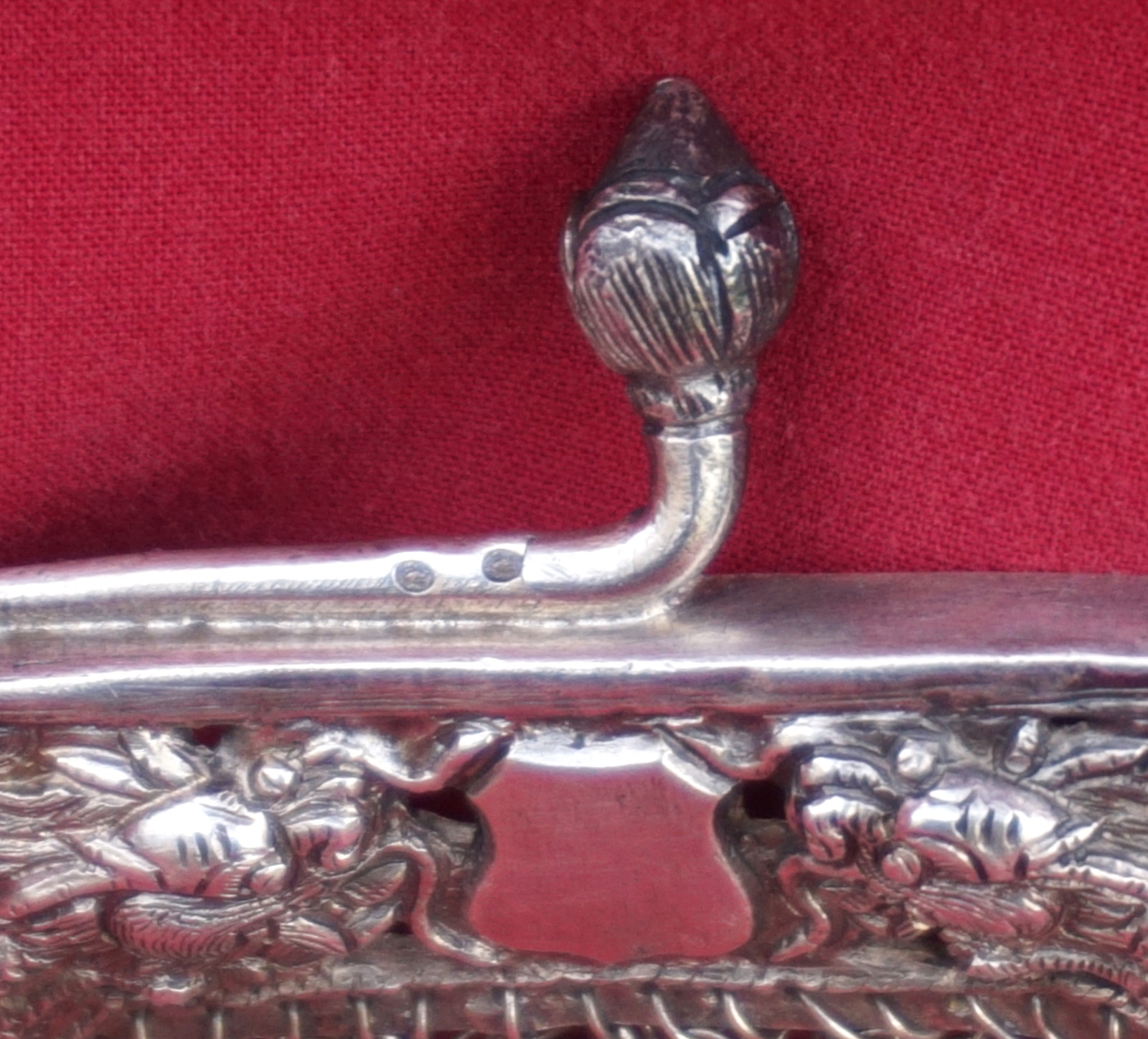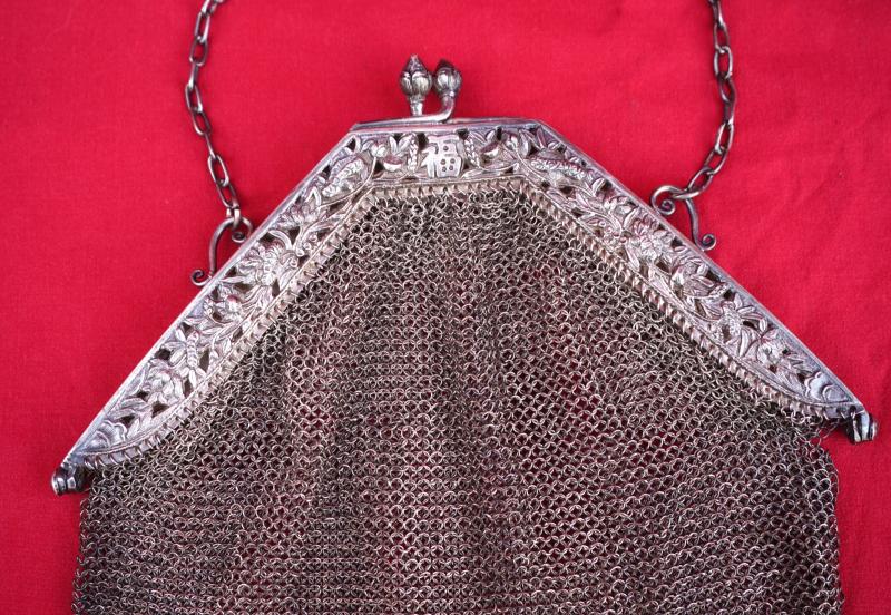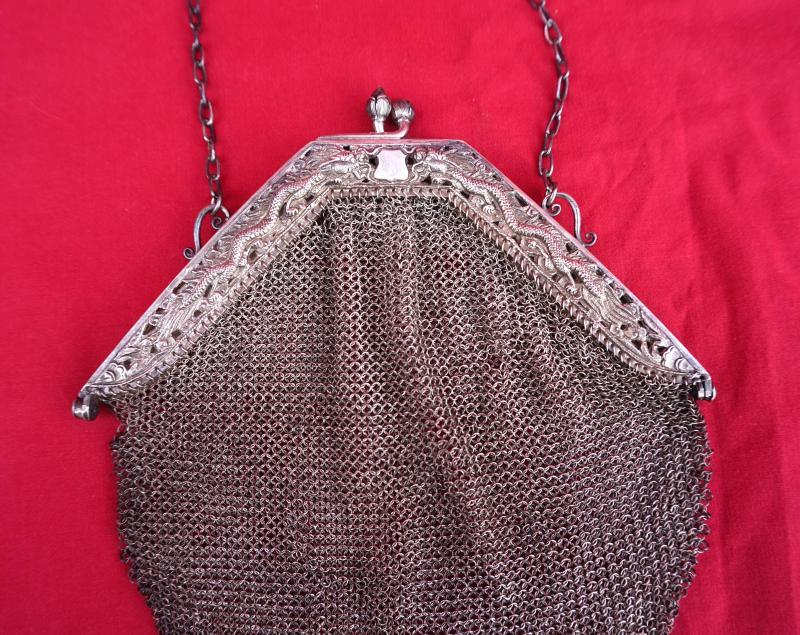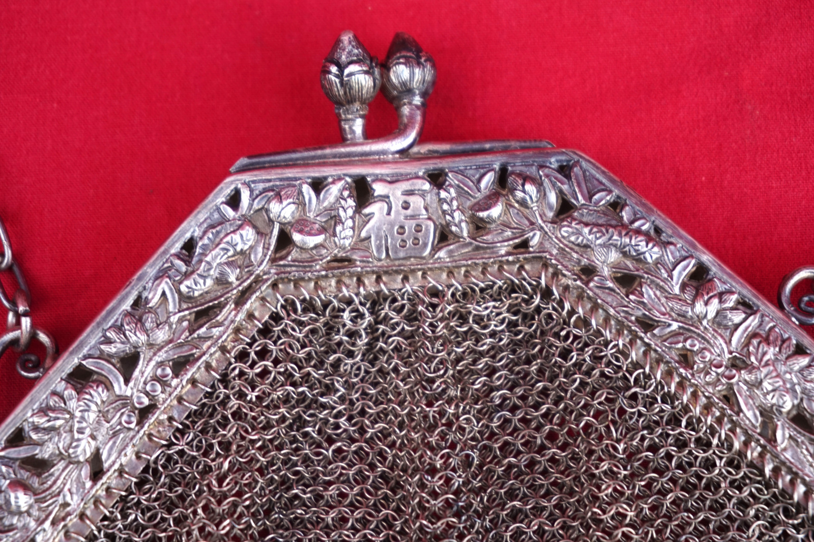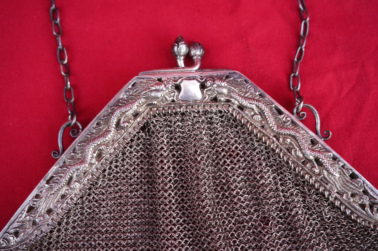 Sac à main en maille à fermoir orné de fleurs et de fruits, en argent massif (.900), Vietnam vers 1900. Hauteur 26.8cm, hauteur totale avec la chaine 39.5 cm, largeur 16.6 cm, poids 178 gr. Bel état, un trou dans la maille.