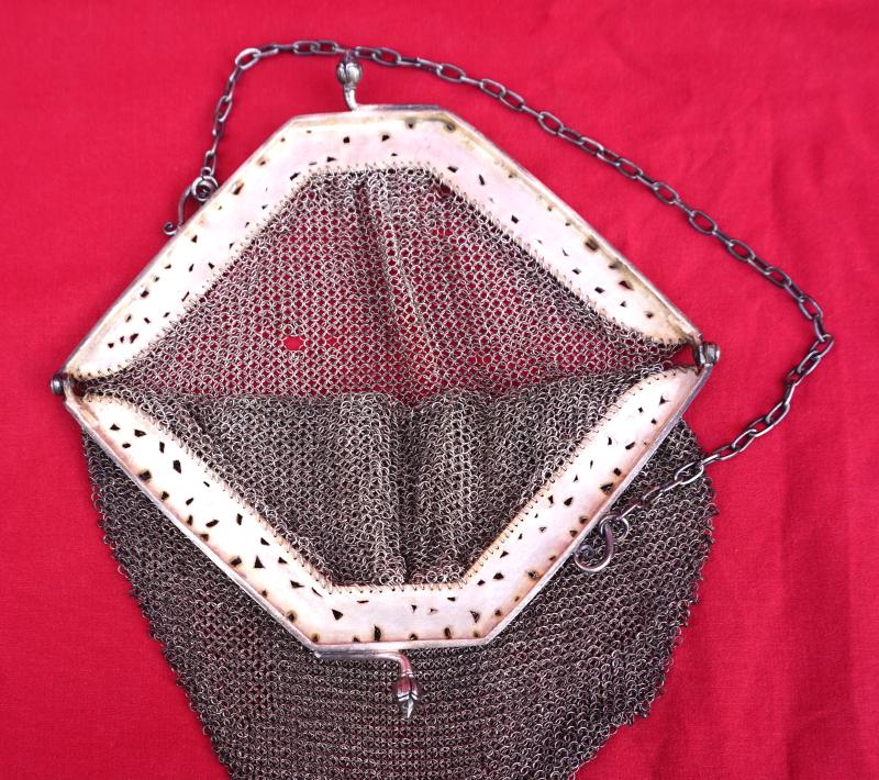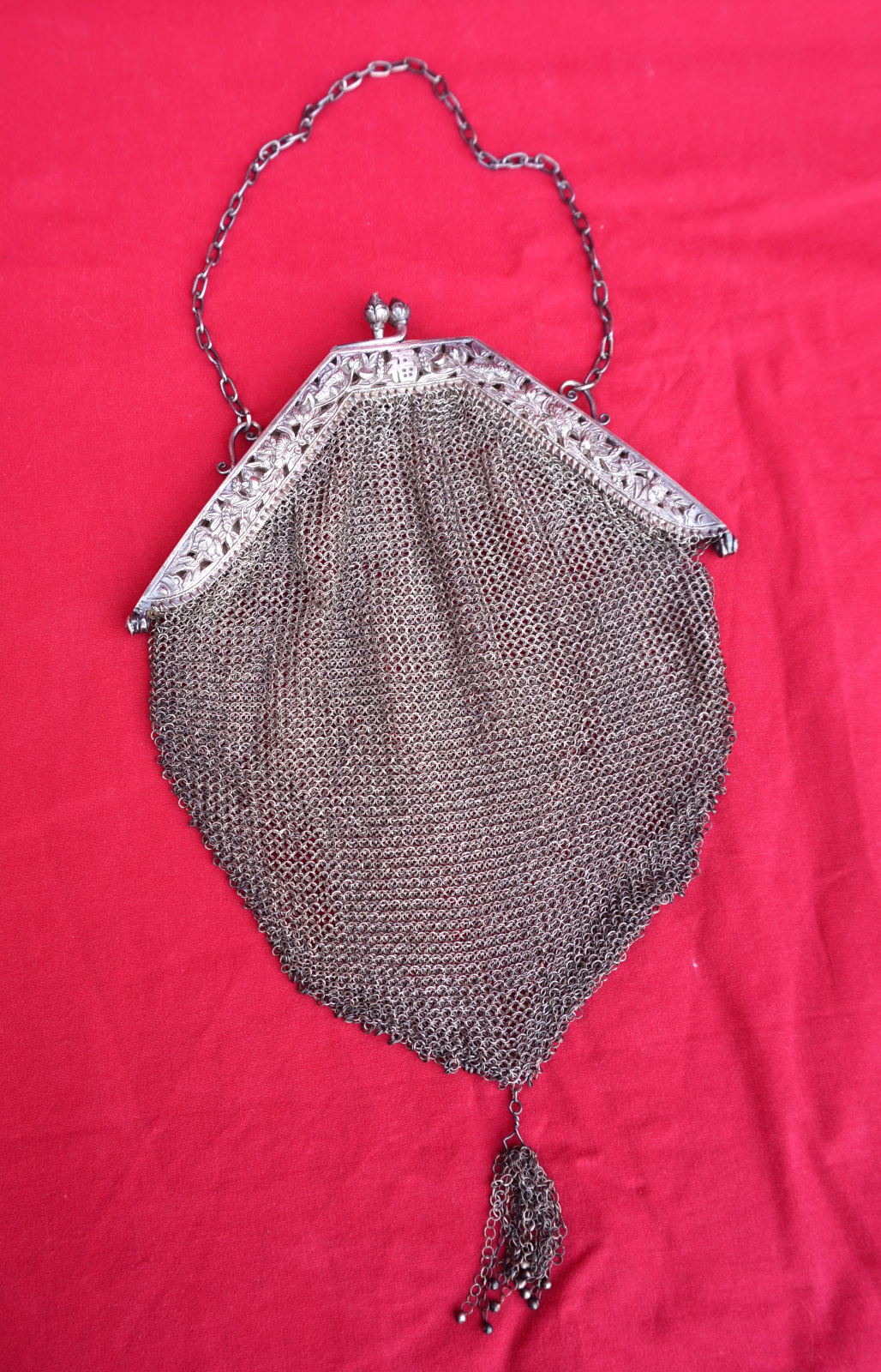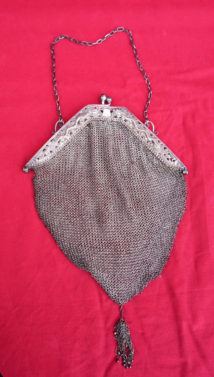 Antique mesh evening bag in sterling silver made in Vietnam during the 1900's. It's hallmaked with the swan french importation sterling silver (.925) guarantee and the silversmith mark. 6 1/2" (16.6cm) width, 10 1/2"(26.8cm) height and 15 1/2" (39.5cm) total height with chain, weight 178 grams. Good condition a small hole in the mesh