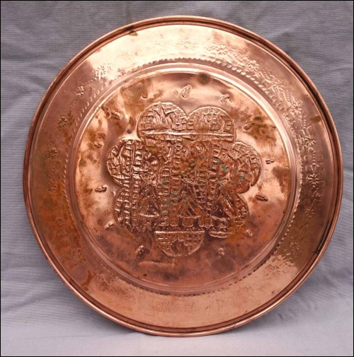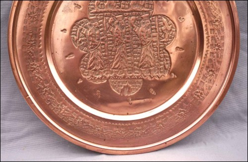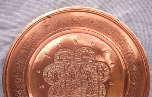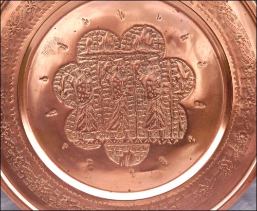 For our French-speaking friends Grand plateau en cuivre repoussé, les rois de Perse, première moitié du XX° siècle. Diamètre 37,2 cm. Très bel état.