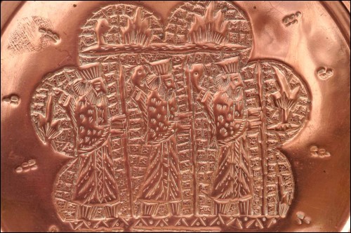 Vintage large repousse copper tray showing the 3 Persian kings. 14 5/8" (37.2cm) diameter. Perfect condition as shown by the following pictures.