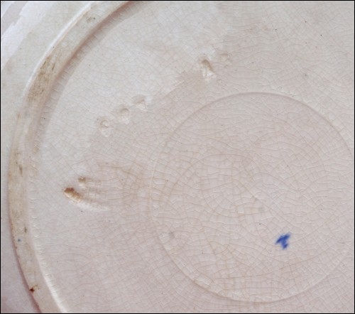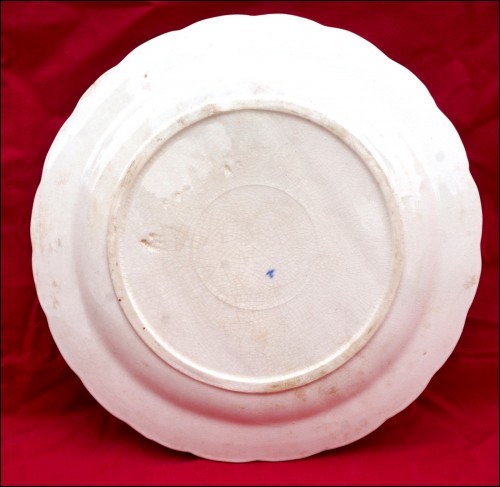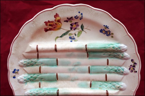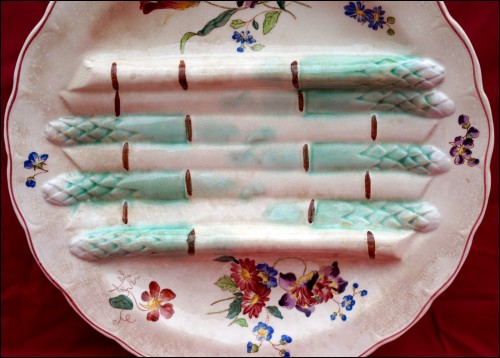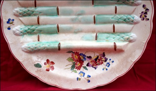 French Art Nouveau asparagus scalloped plate made by Longchamp during the 1890's. It's stamped and signed on the back. 10" (25.5cm) diameter. Good condition only a few slight stains in the past as shown by the following pictures.