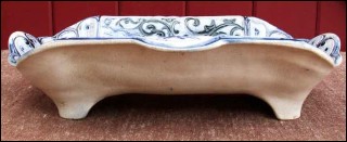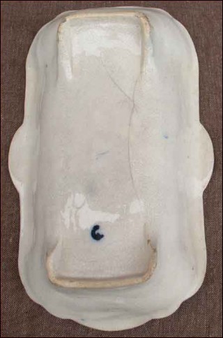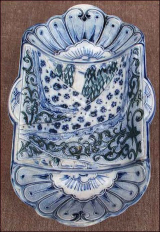 Plat égouttoir à asperges en bleu flowing et vert de la manufacture de Wasmüel vers 1890-1900. Très bel état.Signé sur son fond. Longueur 32.5 cm, largeur 20 cm, hauteur 9.8 cm.