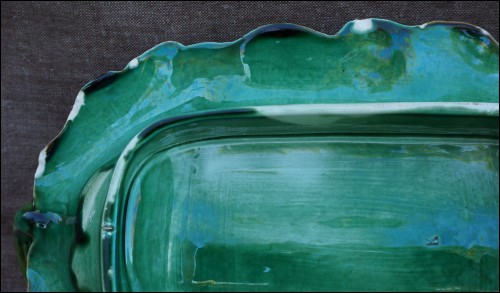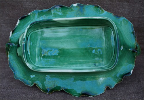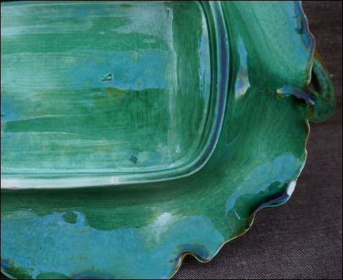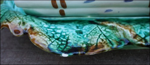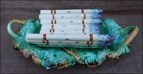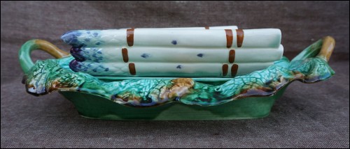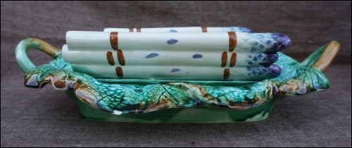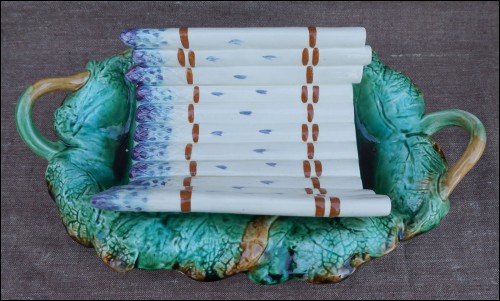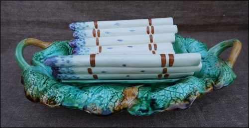 Plat de service pour les asperges en barbotine , vers 1880, manufacture de Onnaing ou de Salins. Bon état, une égrenure sur le bord en façade et 4 égrenures sur le dos invisibles sur le dessus. Signé K en creux au dos. Longueur 44 cm, largeur 27 cm, hauteur 12 cm.