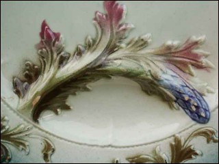 Asparagus plate with asparagus in relief in french majolica made between 1880-1900. Good condition only a original small chip under glaze. Stamped Marque Déposée on the back with 1 III 6. 9"1/2 diameter.