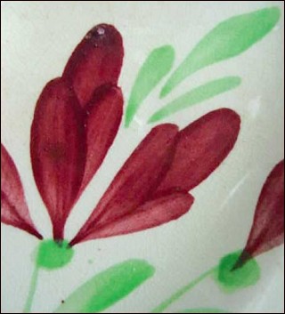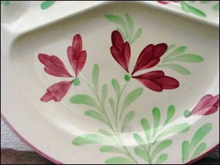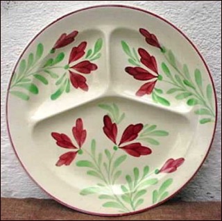 Large grill plate 3 compartments shaped in French majolica made by the famous Onnaing factory near Valenciennes around 1860-1880. The hand painting pattern depicts flowers in red and green on cream background suroounded by a reb edge. 10½" diameter.