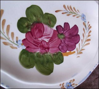 Rare assiette à grillade modèle "Belle fiore" de la collection Chanticleer par le potier Simpsons à Cambridje Angleterre, vers 1950. Elle est peinte à la main et manufacturée sur son fond. Elle est en bon état. Diamètre 26 cm.