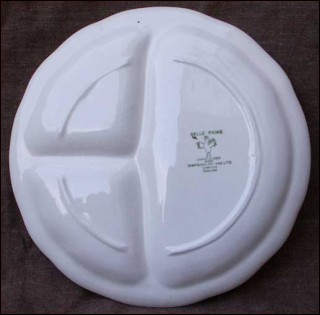 Vintage 3 compartments shaped grill plate Belle Fiore pattern in Chanticleer ware made by the famous Simpsons in Cambridge during the 1950's. The hand painting pattern depicts flowers on white background. Perfect condition. It's stamped on the back Simpsons Cambridge Belle Fiore pattern Chanticleer wear. 10"1/3 diameter.