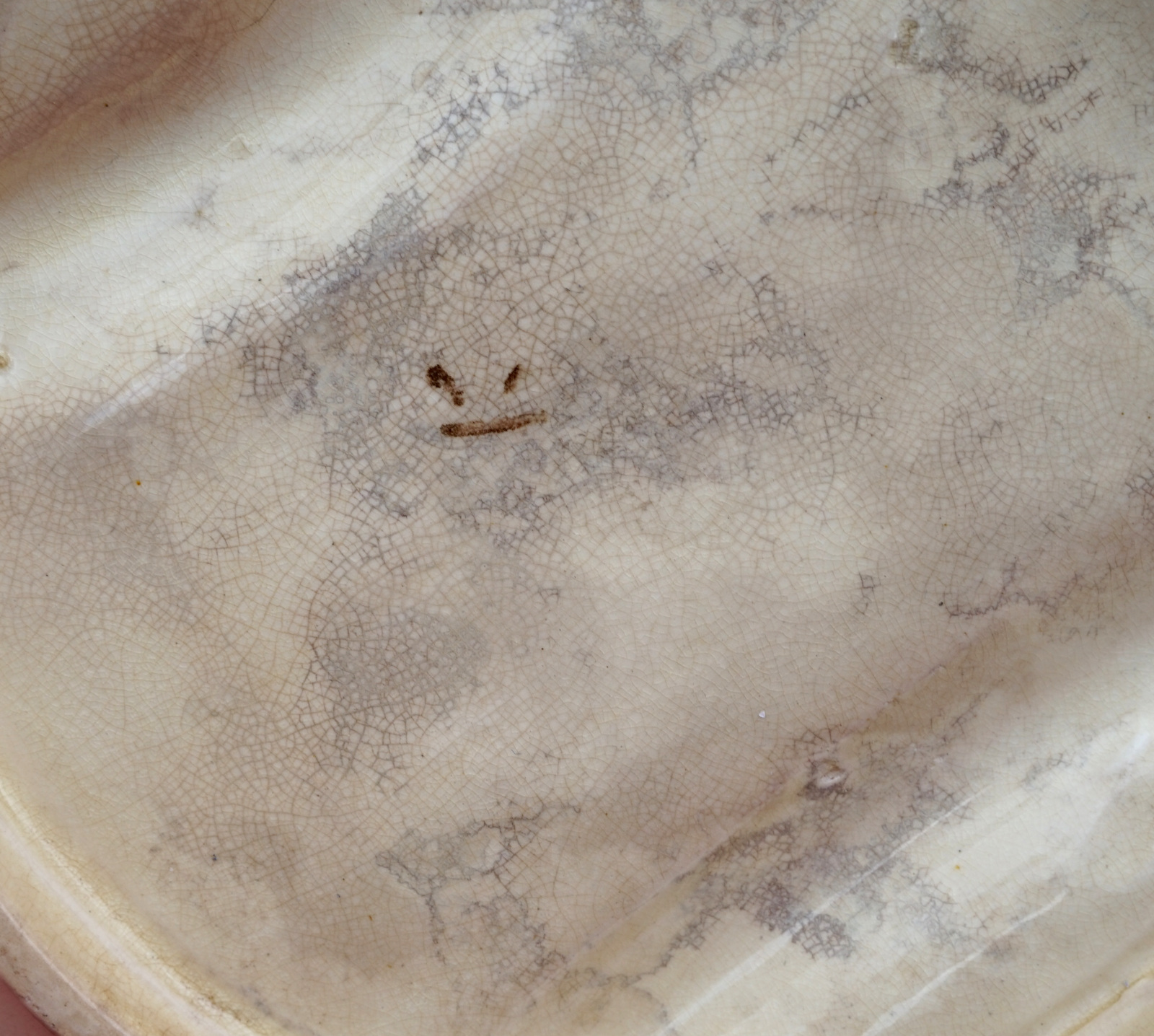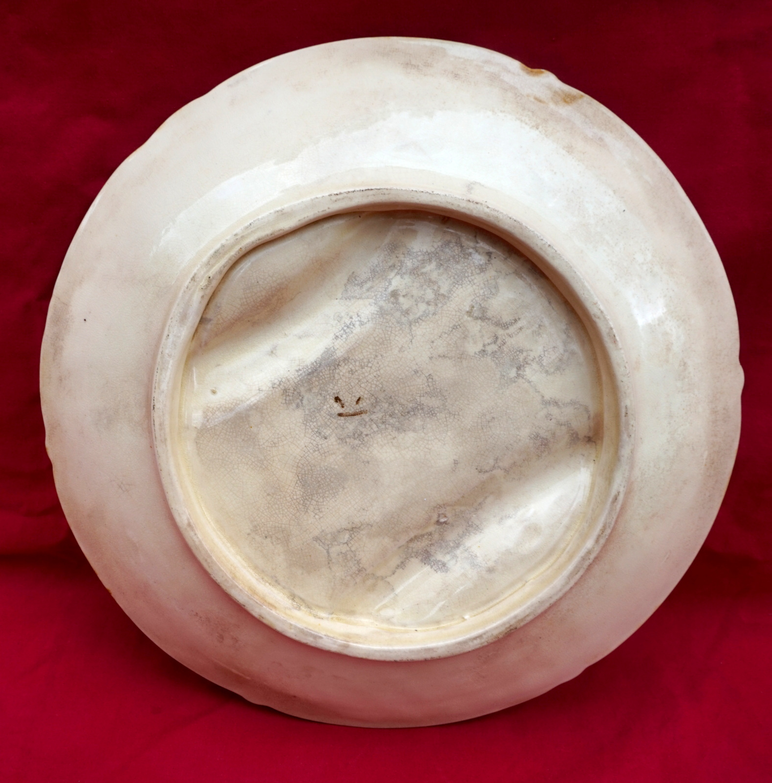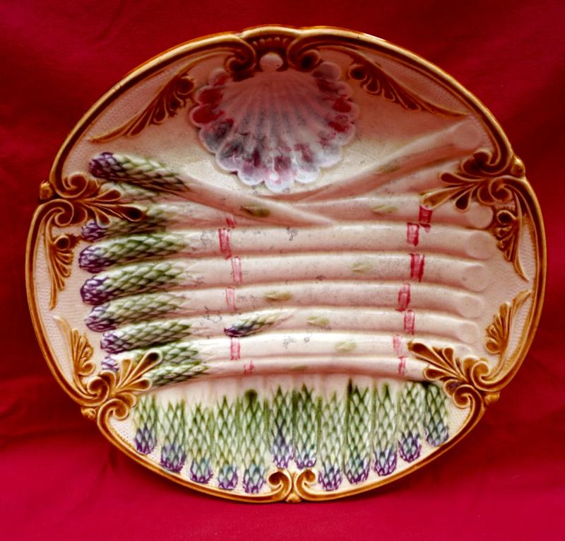 Assiette à asperges en faience, manufacture Onnaing vers 1900. Elle est signée sur son fond. Diamètre 24.2 cm, profondeur 3.8 cm. Bel état, quelques tâches.
