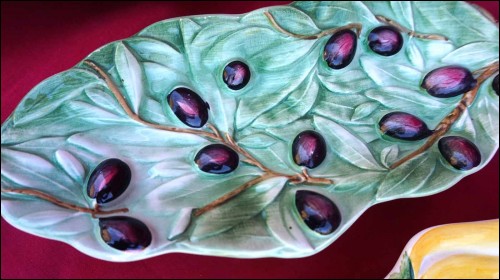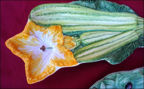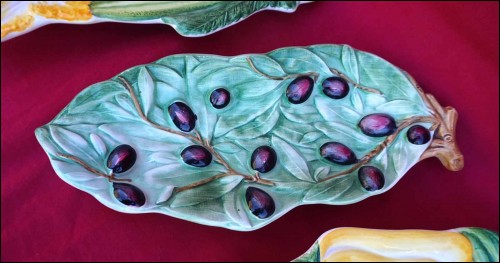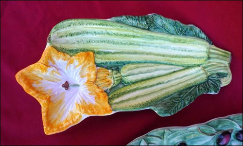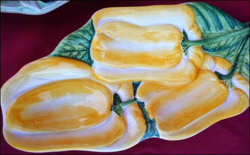Vintage set fo 3 relish dishes majolica showing zucchini, yellow bell pepper and olives in trompe l'oeil made by Valli Cheramiche in Italy during the 1980's. They are signed on the back. 6 1/8" (15.7cm) length, 3 7/8" (10cm) width. Perfect condition as shown by the following pictures.