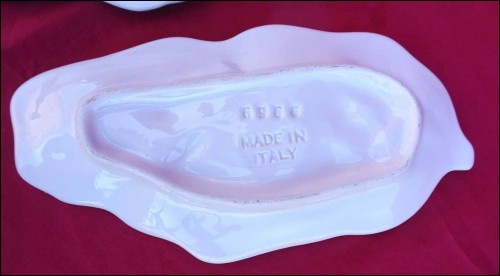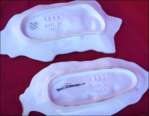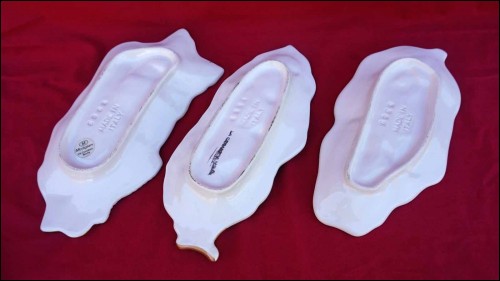 Ensemble de 3 raviers en barbotine en relief à décor de poivron, olives et courgette par Villa Ceramiche Italie vers 1980. Ils sont signés sur leurs fonds. Longueur 15.7cm, largeur 10cm. Parfait état.