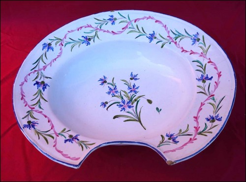 French barber shaving bowl in hand painted faience cornflower barbeaux decor made in Chantille during the 18th century. 8 1/2" (30.7cm) length, 10" (25.5cm) width, 2 7/8" (7.2cm) height. Good condition a few tiny chips on the edge as shown by the following pictures.