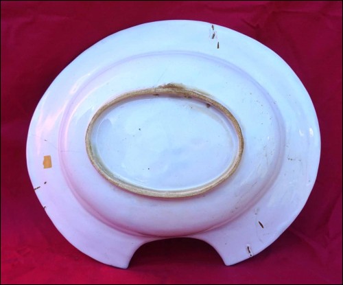 Plat à barbe à décor de barbeaux, Chantilly milieu XVIII° siècle. Bel état, rares petites égrenurs. Longueur 30.7 cm, largeur 25.5 cm, hauteur 7.2 cm.