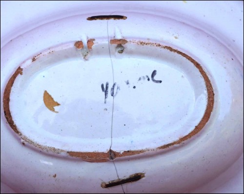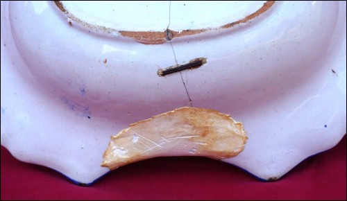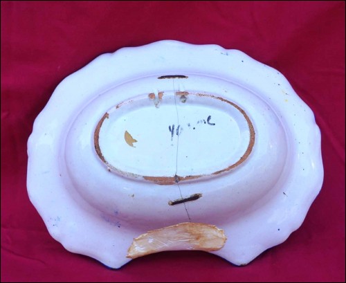 Plat à barbe en faïence de Charolles première moitié XIXe siècle. Racommodé avec des agraffes. Longueur 27.5 cm, largeur 20.5 cm, hauteur 7cm.