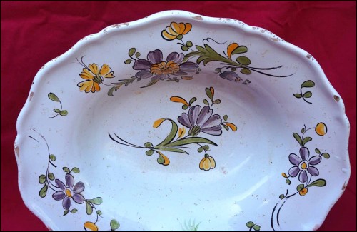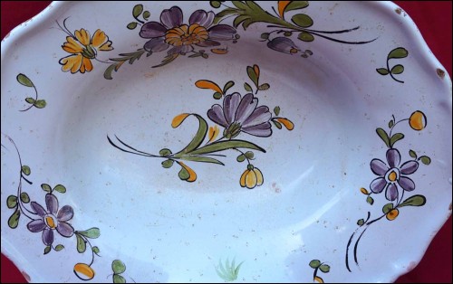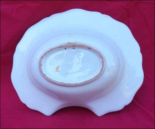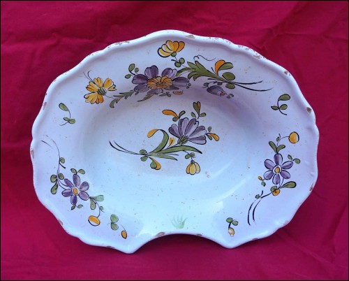 Plat à barbe en faïence de Desvres début du XX° siècle. Longueur 31 cm. bel état, petites égrenures. largeur 25.3 cm, hauteur 7.7 cm.