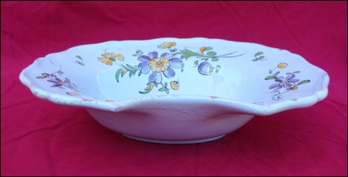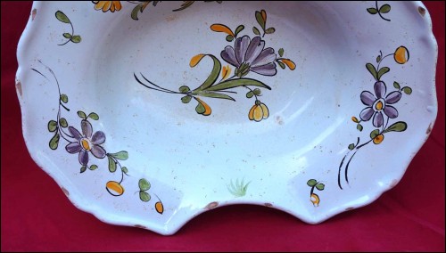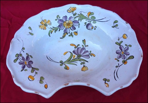 French barber shaving bowl in hand painted faience made by Desvres early 20th century. 12 1/8" (31cm) length, 10" (25.3cm) width, 3" (7.7cm) height. Good condition a few tiny chips on the edge as shown by the following pictures.