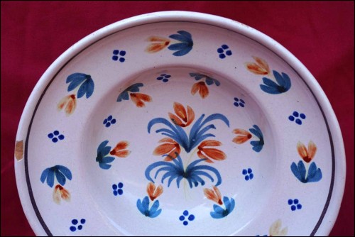 French hand painted faioence barber shaving bowl made by Nevers during the second hald of the 18th century. 9" (23cm) diameter, 3 " (7.7cm) height. Good condition a chip on the edge as shown by the following pictures.