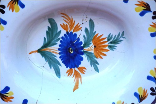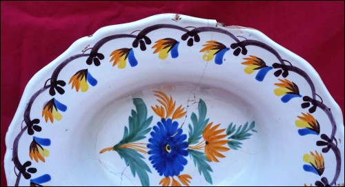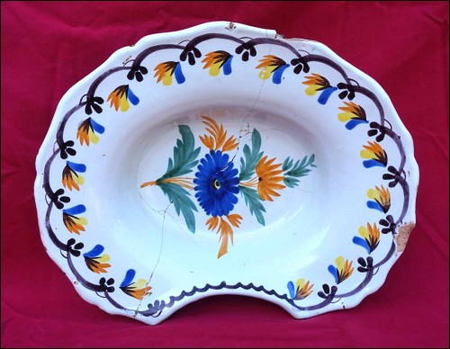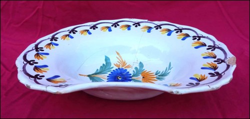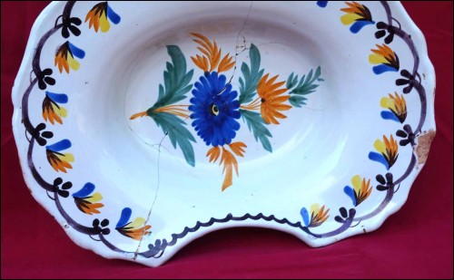 French hand painted faience barber shaving bowl made by Nevers early 19th century. 12" (30.5cm) length, 9" (24.2cm) width, 2 3/4" (7cm) height. It has beee repair as shown by the following pictures.