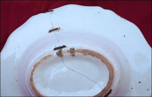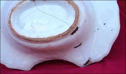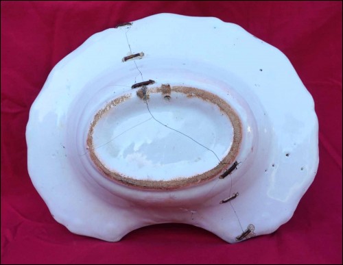Plat à barbe en faïence de Nevers début XIX siècle. Raccommodé avec de agrafes. Longueur 30.5 cm, largeur 24.2 cm, hauteur 7 cm.