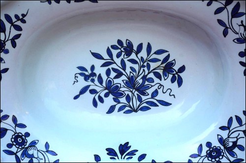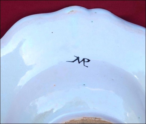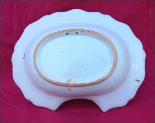 Plat à barbe en faïence de Rouen deuxième moitié du XVIIIe siècle, signée MP. Très bel état. Longueur 32 cm, largeur 24 cm, hauteur 8 cm.
