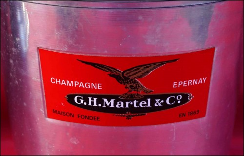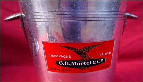 Seau à champagne publicitaire en aluminium pour les champagnes G H Martel & Co à Epernay. Hauteur 19.7 cm, diamètre 19.7 cm. Bel état.
