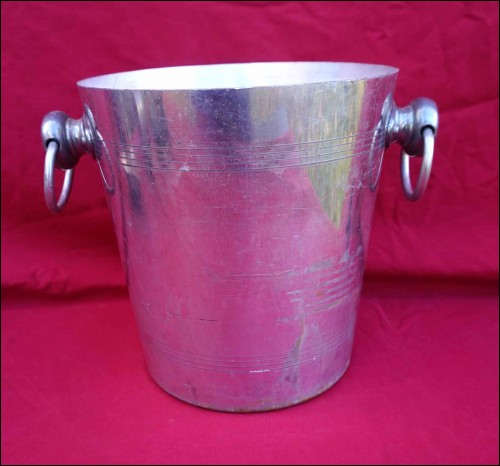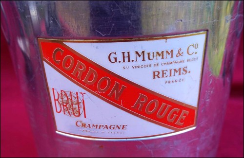 Seau publicitaire en aluminium pour rafraîchir les champagnes G H Mumm Cordon Rouge à Reims . Bel état d'usage. Signé Made in France Hauteur 20 cm, diamètre 19,3 cm.