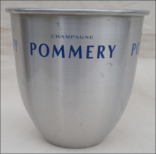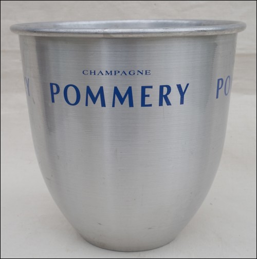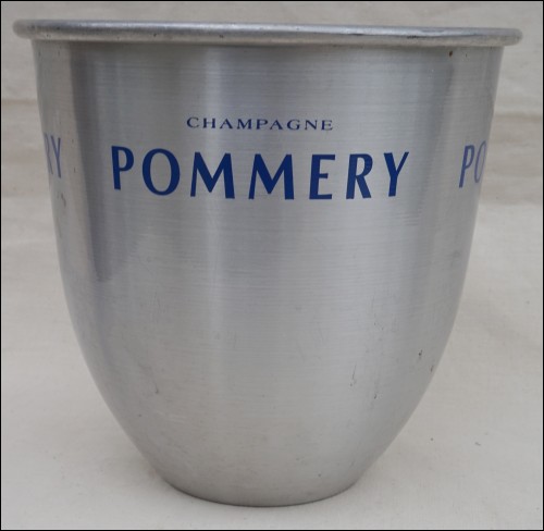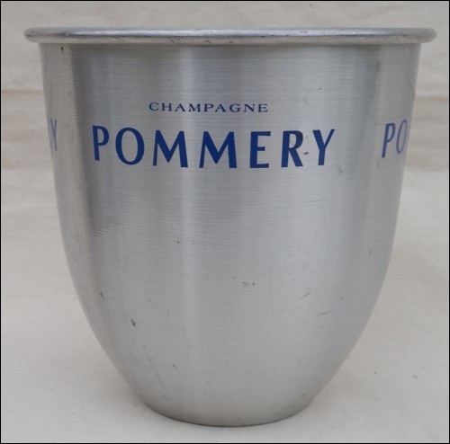 Seau publicitaire en aluminium vernis pour rafraîchir les champagnes Pommery.Il est signé Faucogney 70310 VOGALU Made in France. Hauteur 21 cm, diamètre 21,5 cm. Etat d'usage, deux petites bosses.